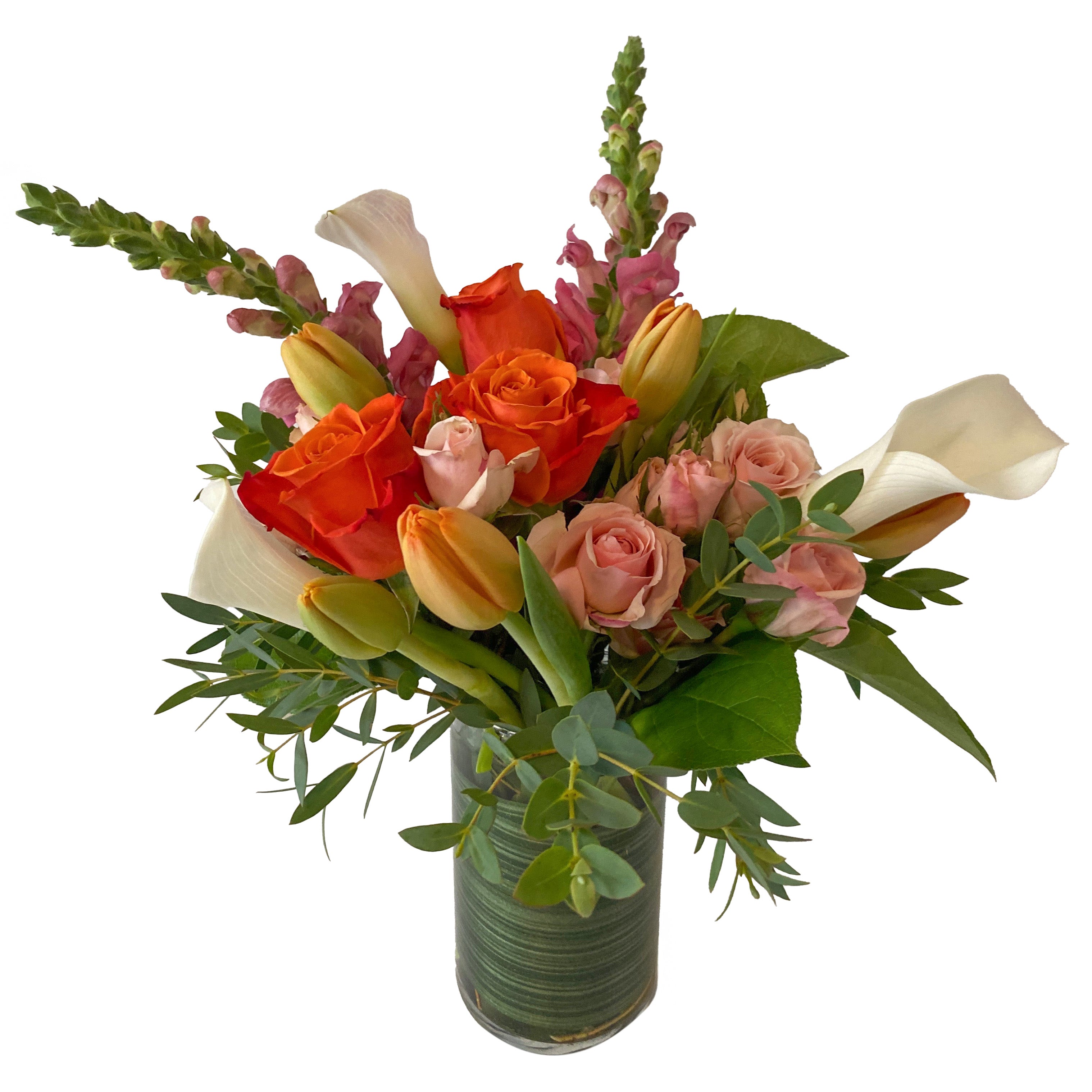 Rich oranges and pretty pinks blend beautifully in this arrangement of tulips, roses, spray roses, calla lilies and snapdragons. It's warm colors are sure to send a warm welcome to all (10'' tall and 8'' across).