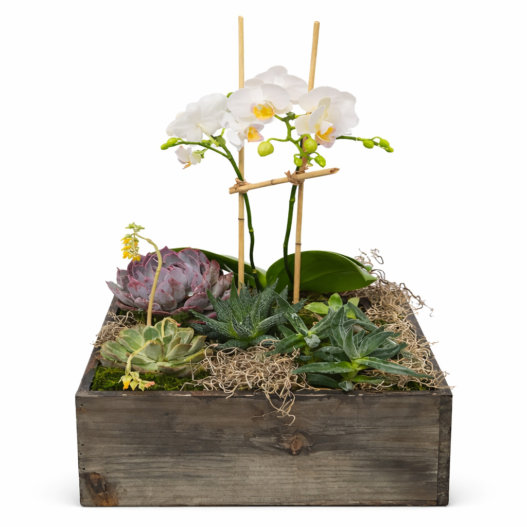 Bring a little green to the office with this beautiful succulent planter standing tall with a boutique phalaenopsis orchid to add a bit of beauty to the amazing textures of this piece (12'' tall and 12'' across) Please order at least one day in advance so we can pick up your fresh plants and repot them with support and beautiful accents.