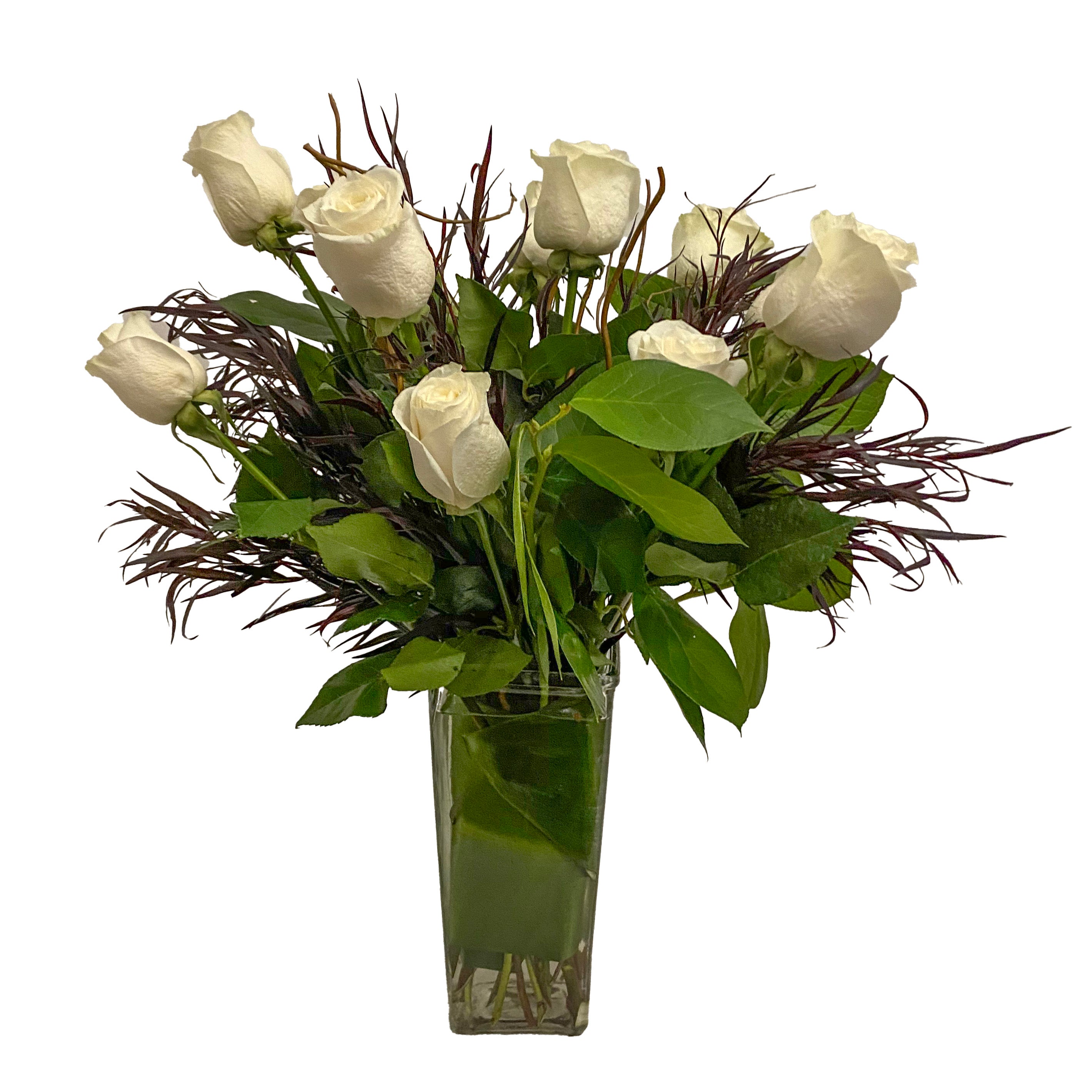 White roses are a symbol of purity, innocence and fresh starts! This beautiful display of a dozen white roses is the perfect way to celebrate an anniversary or new addition to the family! (16-18'' tall and 10'' across)! The agonis pictured is seasonal and will be replaced with eucalyptus when not available.