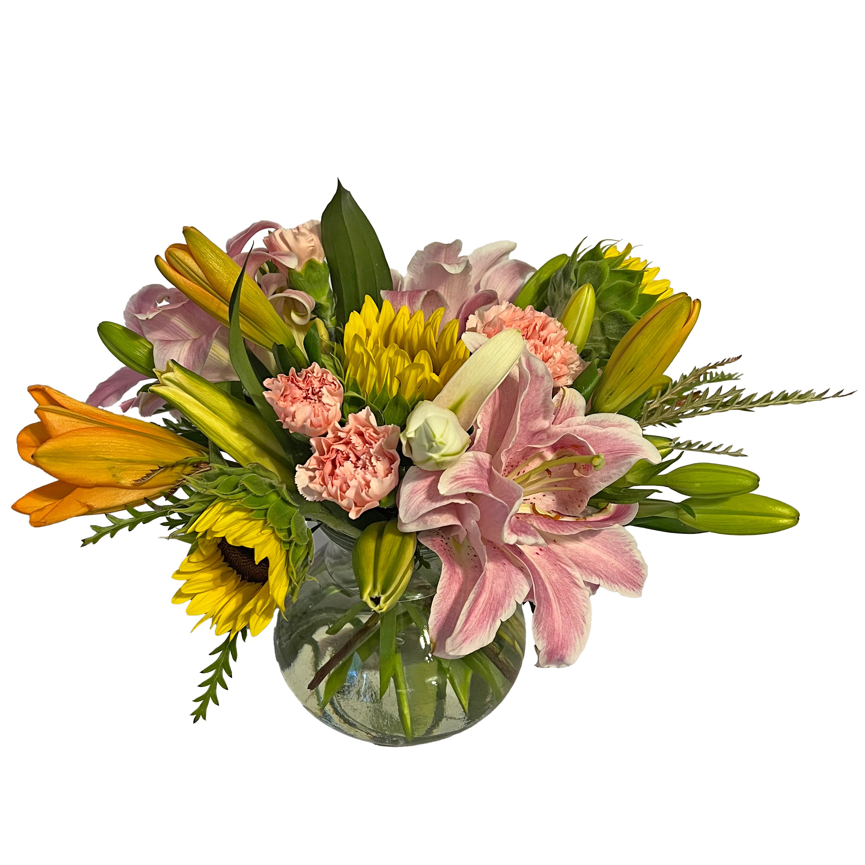 Beautiful rose lilies, orange asiatic lilies, sunflowers and pink carnations warm up your home and delight your heart. These gorgeous flowers are displayed in our favorite rosey posey vase (10" tall and 12" across)!