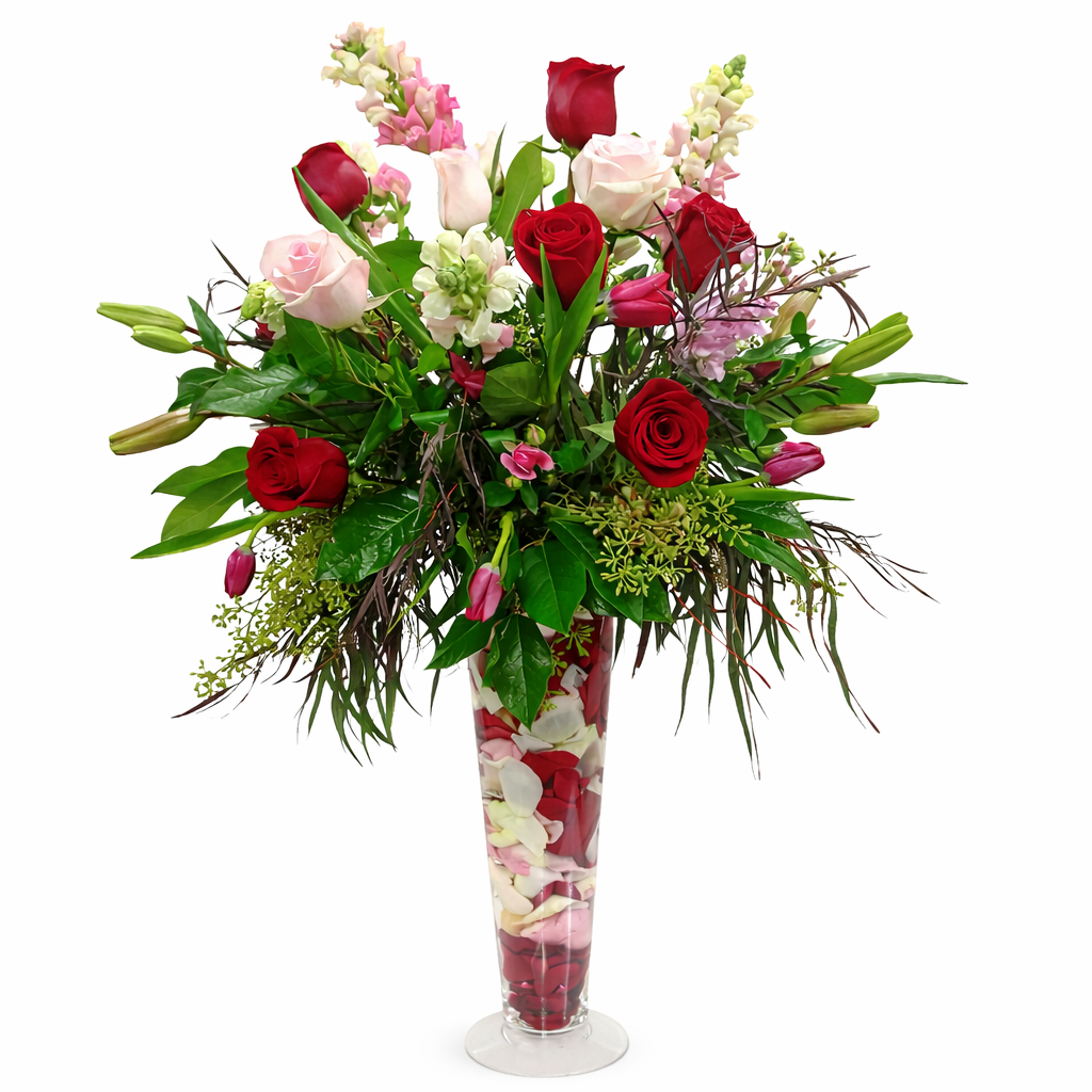 Tall and elegant: This very large piece features Lilies, Roses, Snaps, stock, tulips and lush greens in a tower vase filled with petals! It's AMAZING getting this delivery (36'' tall and 20'' across)! Vase may vary depending on availability and travel distance for delivery.