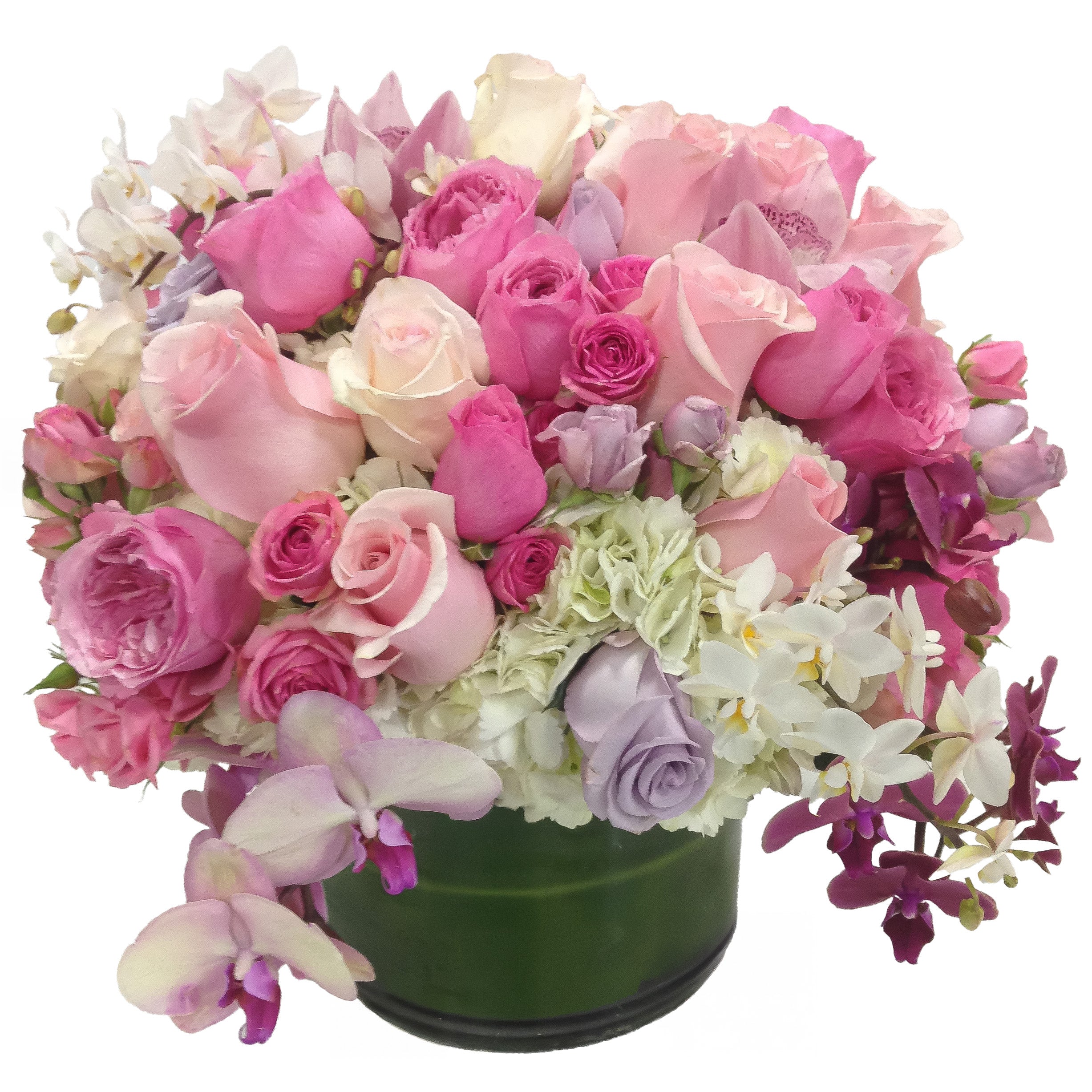 Gorgeous garden roses, vendela roses, spray roses, hydrangea and breath-taking orchids fill this large cylinder with beauty beyond any other arrangement. If you want a ''WOW'' then here it is (12'' tall and 12'' across)!