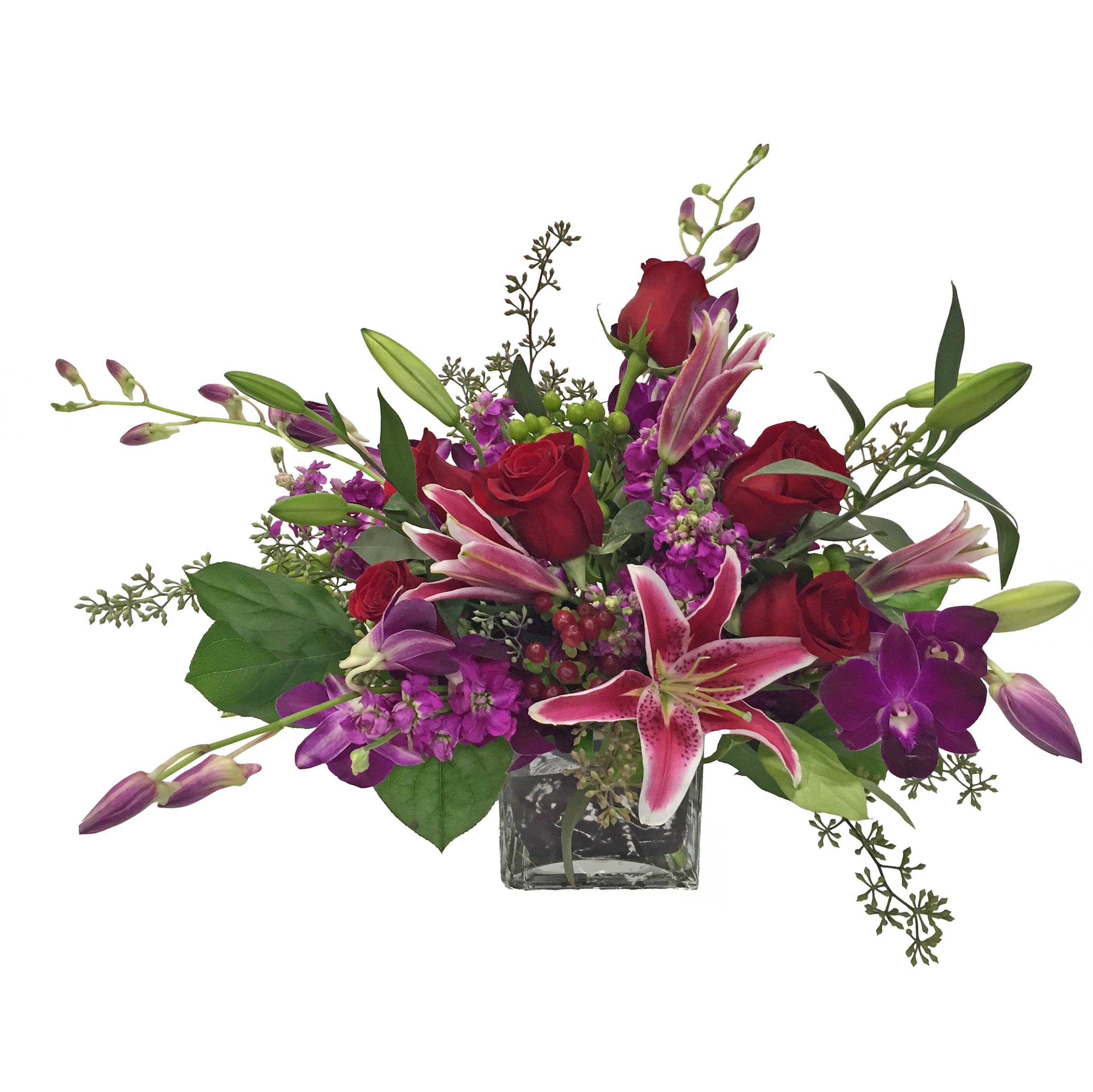 This is no typical garden arrangement! It's deep jewel toned flowers make a big impression with it's beautiful lilies, roses, matthiola and dendrobium orchids (8'' tall and 18'' across). Some flowers in this mix are specialty flowers and we require your order at least a day ahead of time to avoid substitutions.