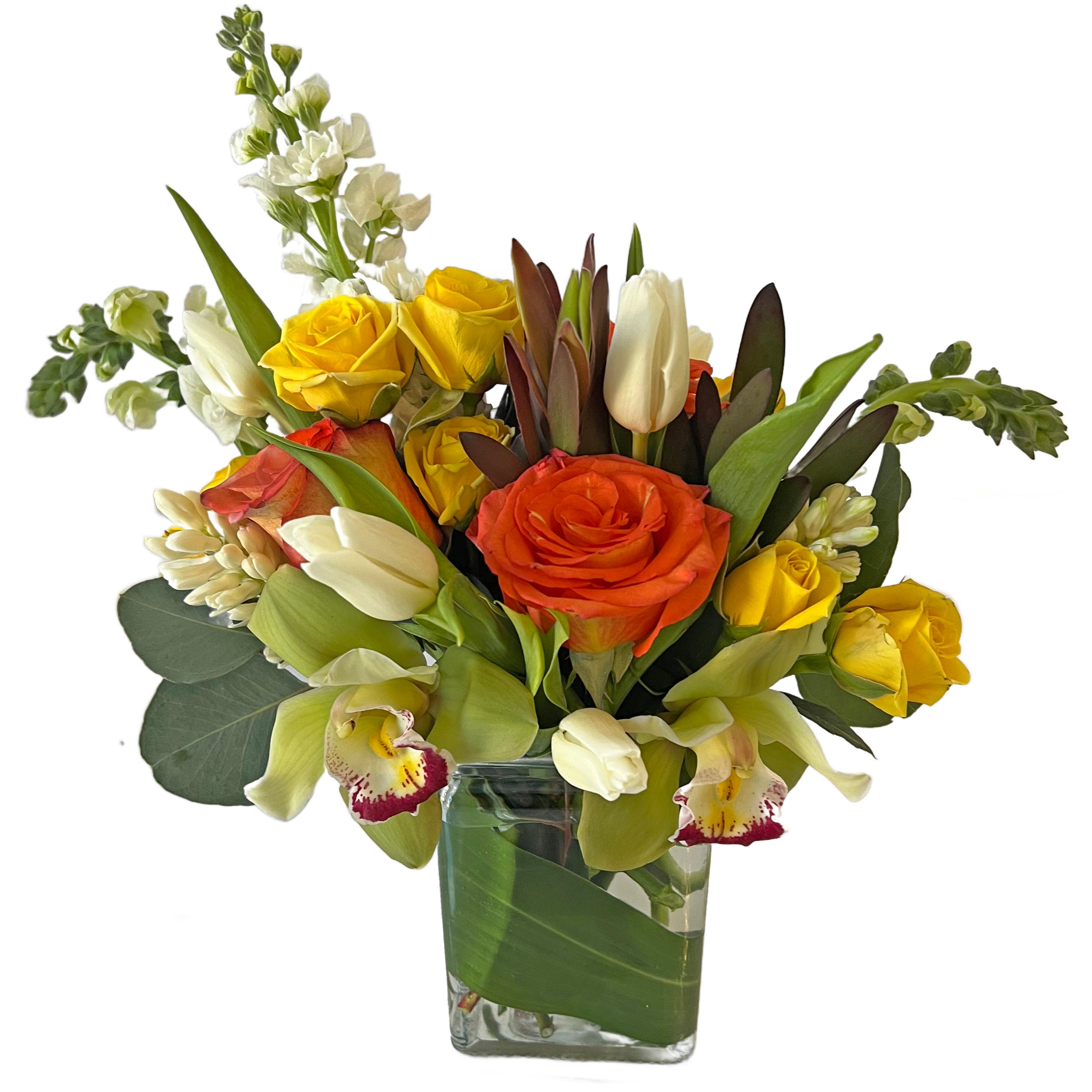 Cool off with this non-alcoholic Epicurean delight! Mixed with Cymbidium Orchids, Roses, Tulips and a little flare, this piece screams sunshine and fun (14'' tall and 10'' across)!
