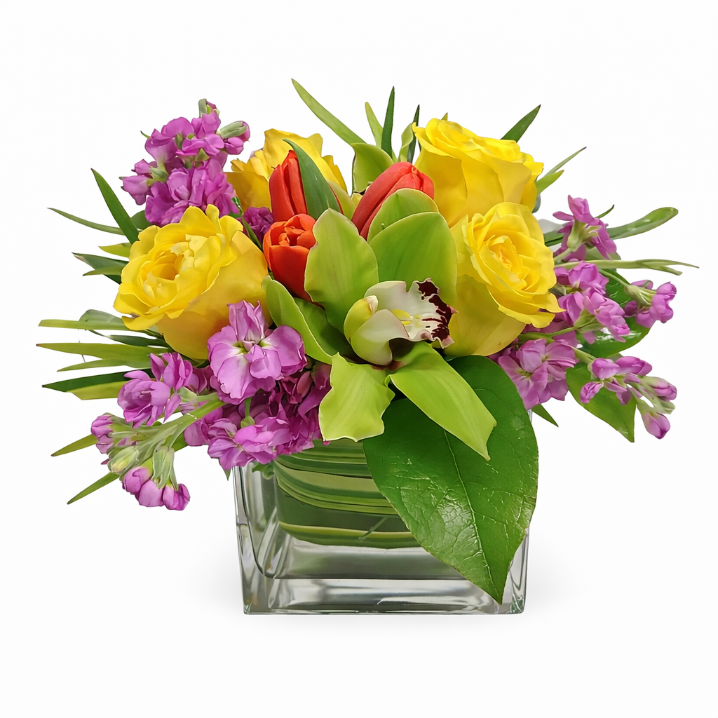 This petite arrangement of pink matthiola, yellow roses, orange tulips and green orchids is sure to give anyone a little pick me up and smile. Great for cheering a friend or adding a touch of color to your desk (8'' tall and 6'' across)! Vase may vary between a square and a cylinder depending on what is available.