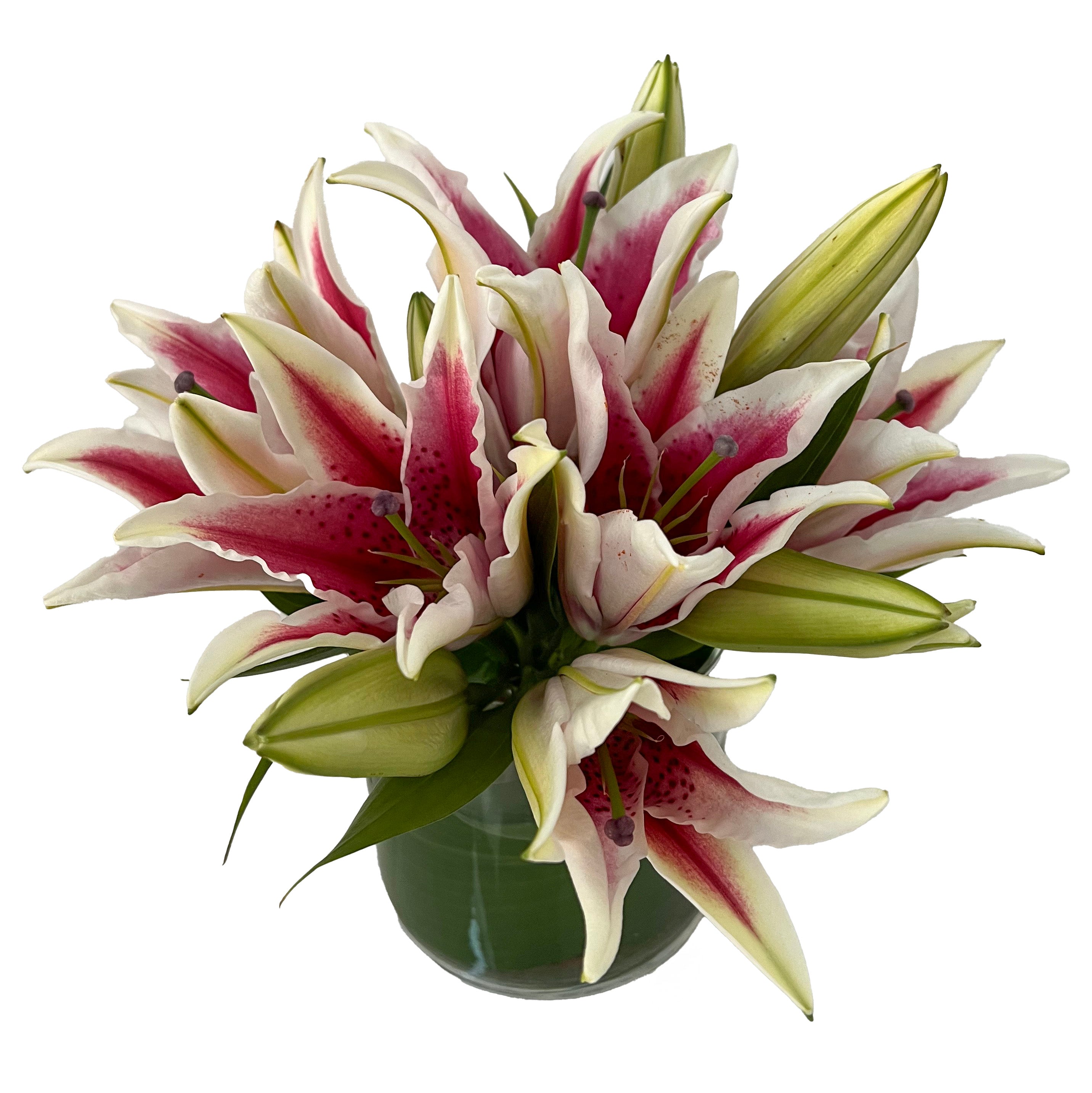 A stylish arrangement of our fresh-cut, seasonal Lilies in a vase lined with ti leaves (6-7'' tall and 5-6'' wide). This arrangement is a highly sophisticated couture design. Lilies are not 🐱 cat-safe; best sent to a cat-free home or to an office.