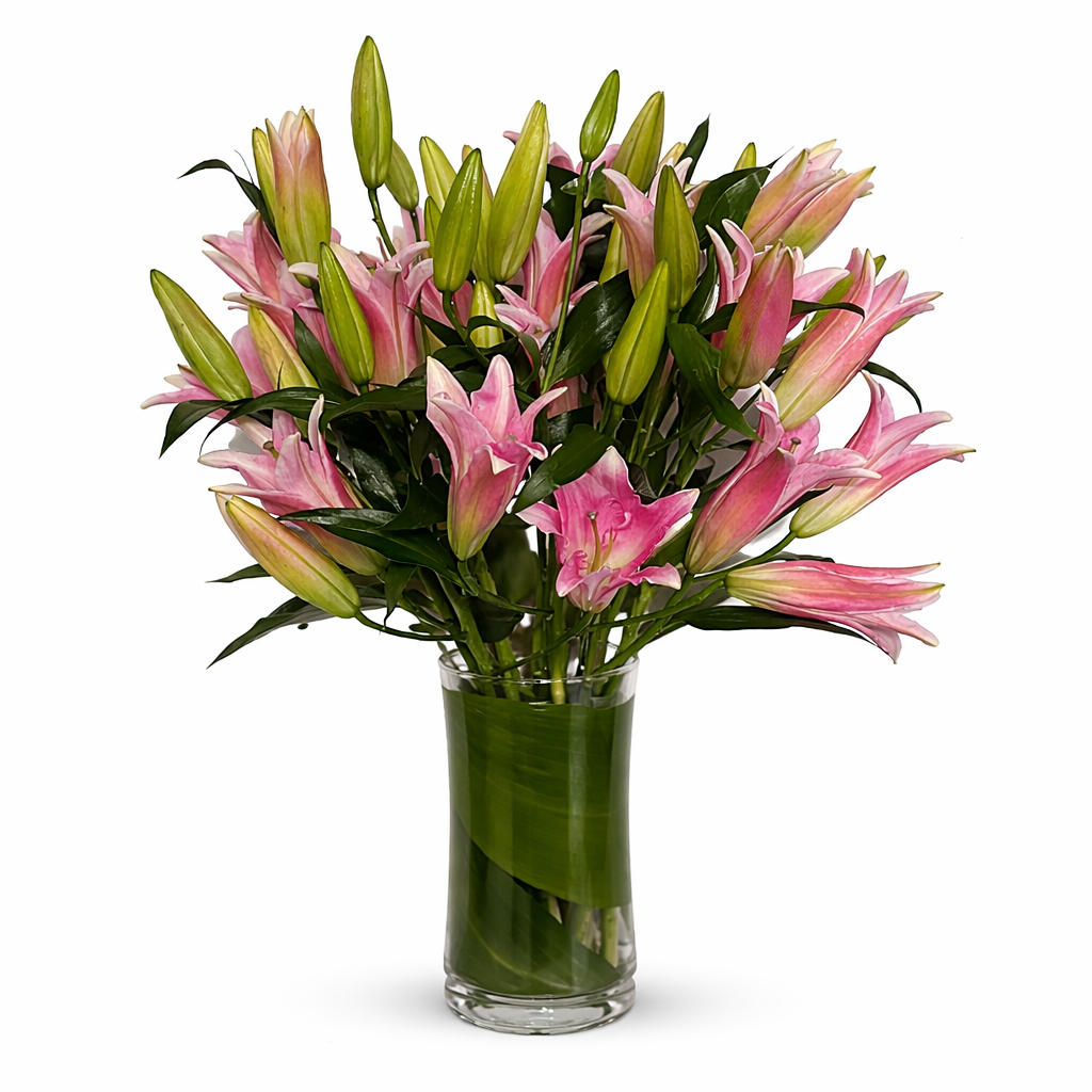Nothing says beauty quite like a bountiful bouquet of stargazer lilies! It's sure to bring lasting enjoyment for any home or office! Please be aware that lilies can have a strong smell as well as lots of pollen which can make them unsuitable for someone with allergies (18'' tall and 12'' across). Color and vase are subject to availability and may change slightly depending on our inventory.