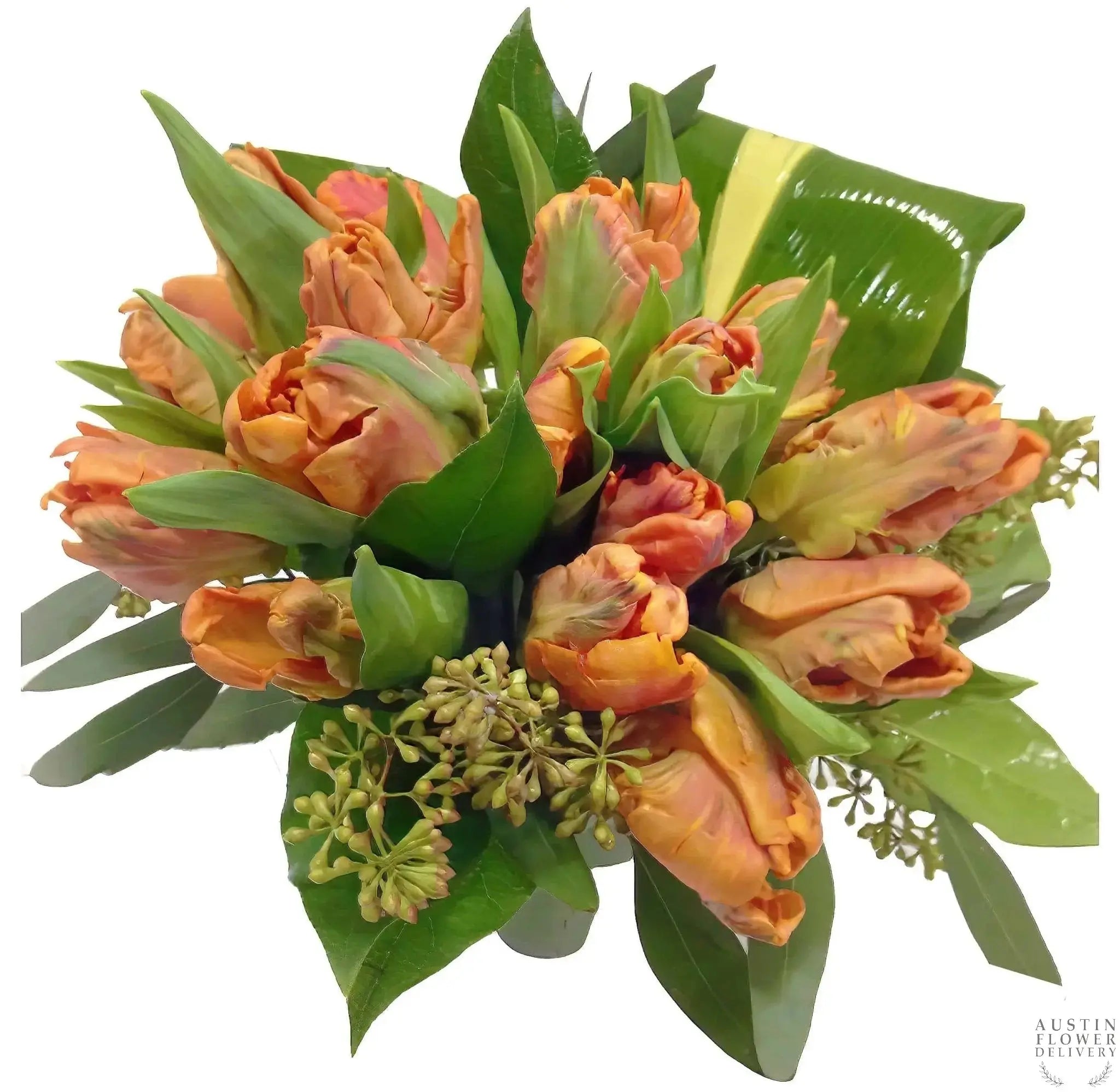 A special variety of tulips known as parrot tulips in any color are gorgeous and make this arrangement a sure hit every time (9'' tall and 5'' across)! And, since tulips keep growing even after they are cut, this arrangement will grow and increase in size as the tulips bloom! Please order ahead for a specific color. Parrot tulips come in orange, green, red and pink and may be subbed with other specialty tulips like double tulips if not available.