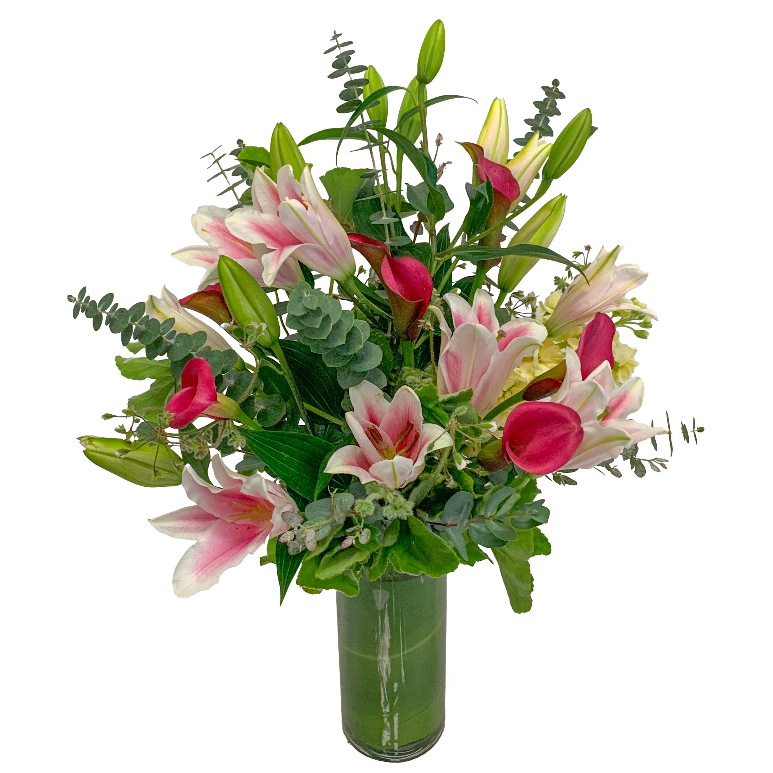 Lilies have a rare beauty and this arrangement captures both stargazer lilies and gorgeous call lilies as well. The eucalyptus gives it great texture and if your person is a lover of lilies this arrangement is sure to make them smile (20'' tall and 12'' across)!