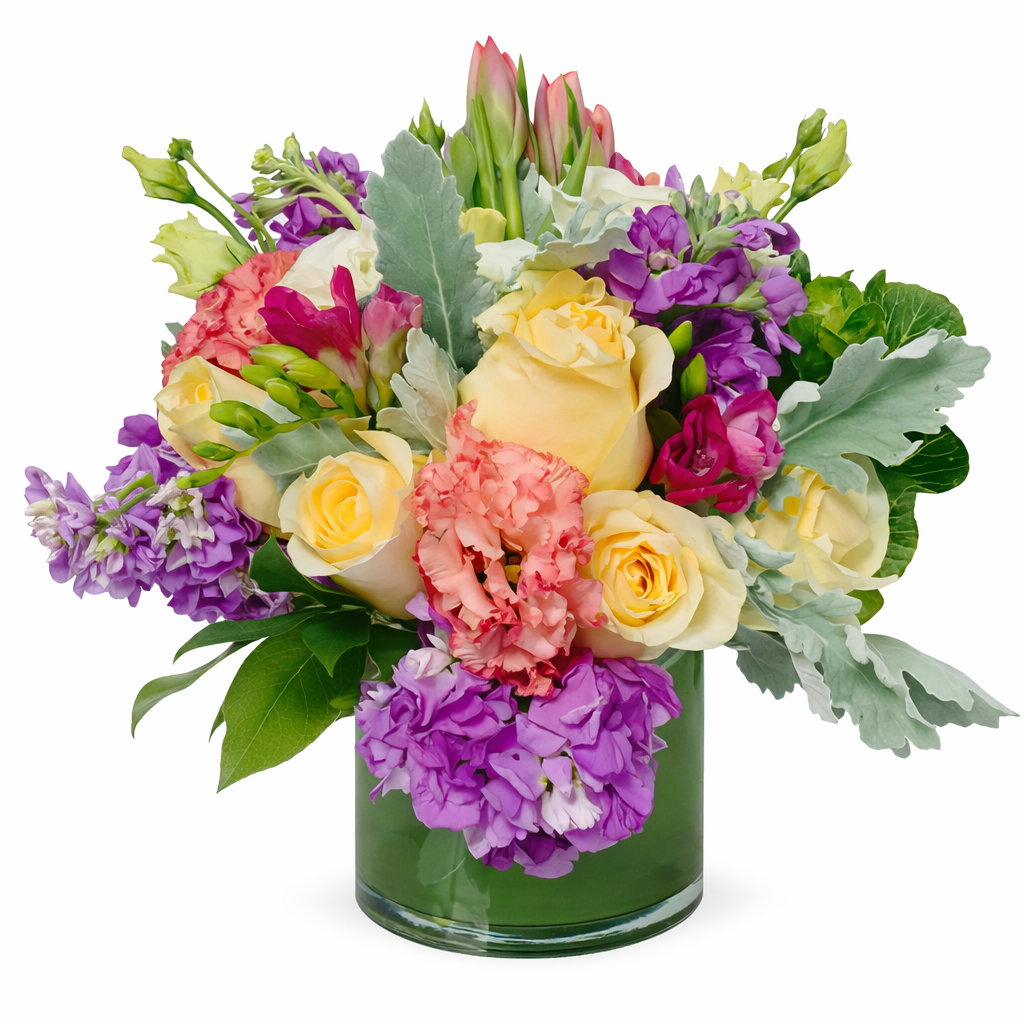 Looking for something special? This arrangement fits the bill with its gorgeous colors and lovely mix of flowers including roses, lisianthus, stock and other seasonal flowers (8'' tall and 8'' across). It's feminine touches are sure you make your lady feel loved!