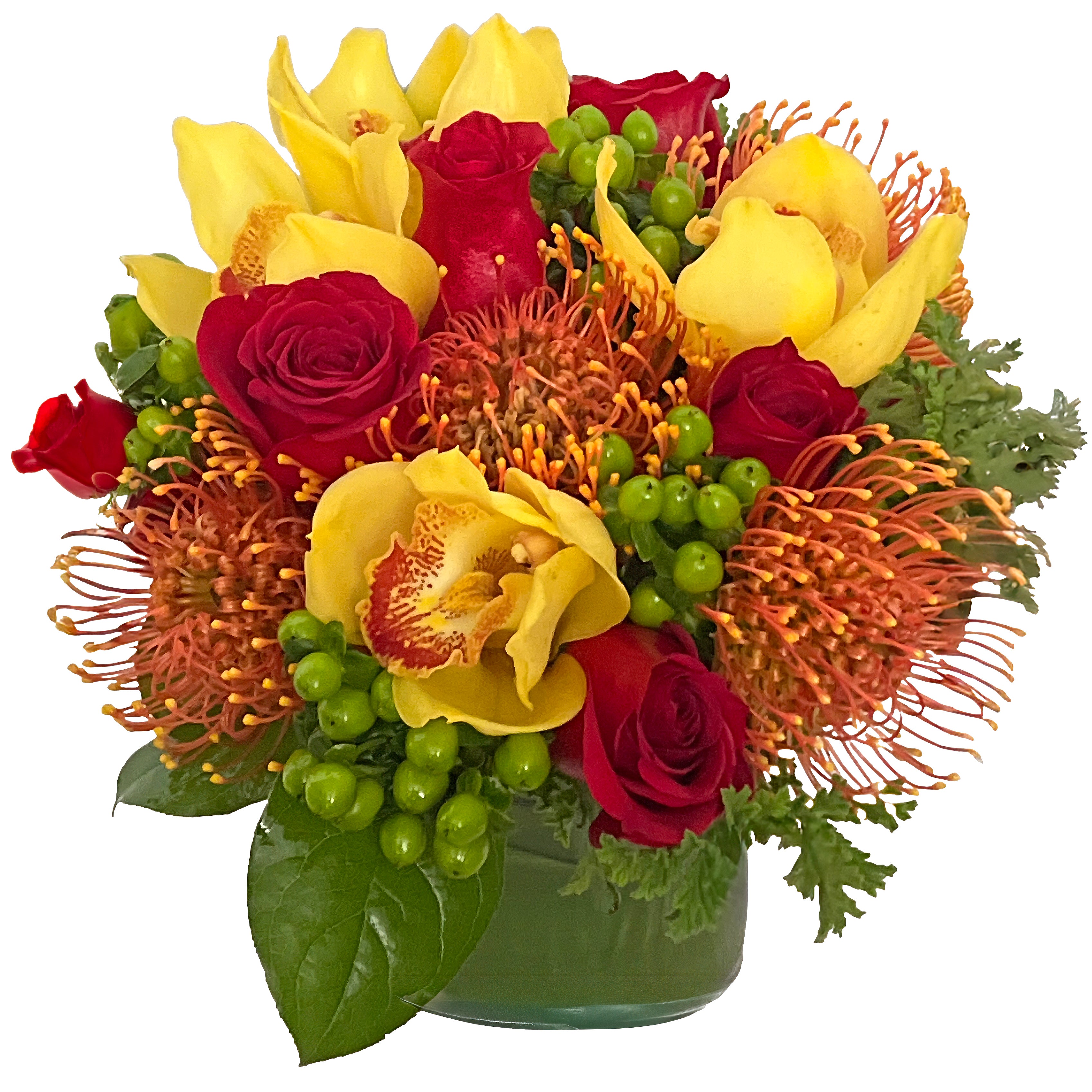 Are you thinking about the beach yet? Maybe tropical fruit like luscious pineapple and colorful dragon fruit? If not, this arrangement is sure to bring you there with gorgeous Pincushions, Orchids, and Roses (8'' tall and 8'' across). Please order ahead for these specialty flowers.