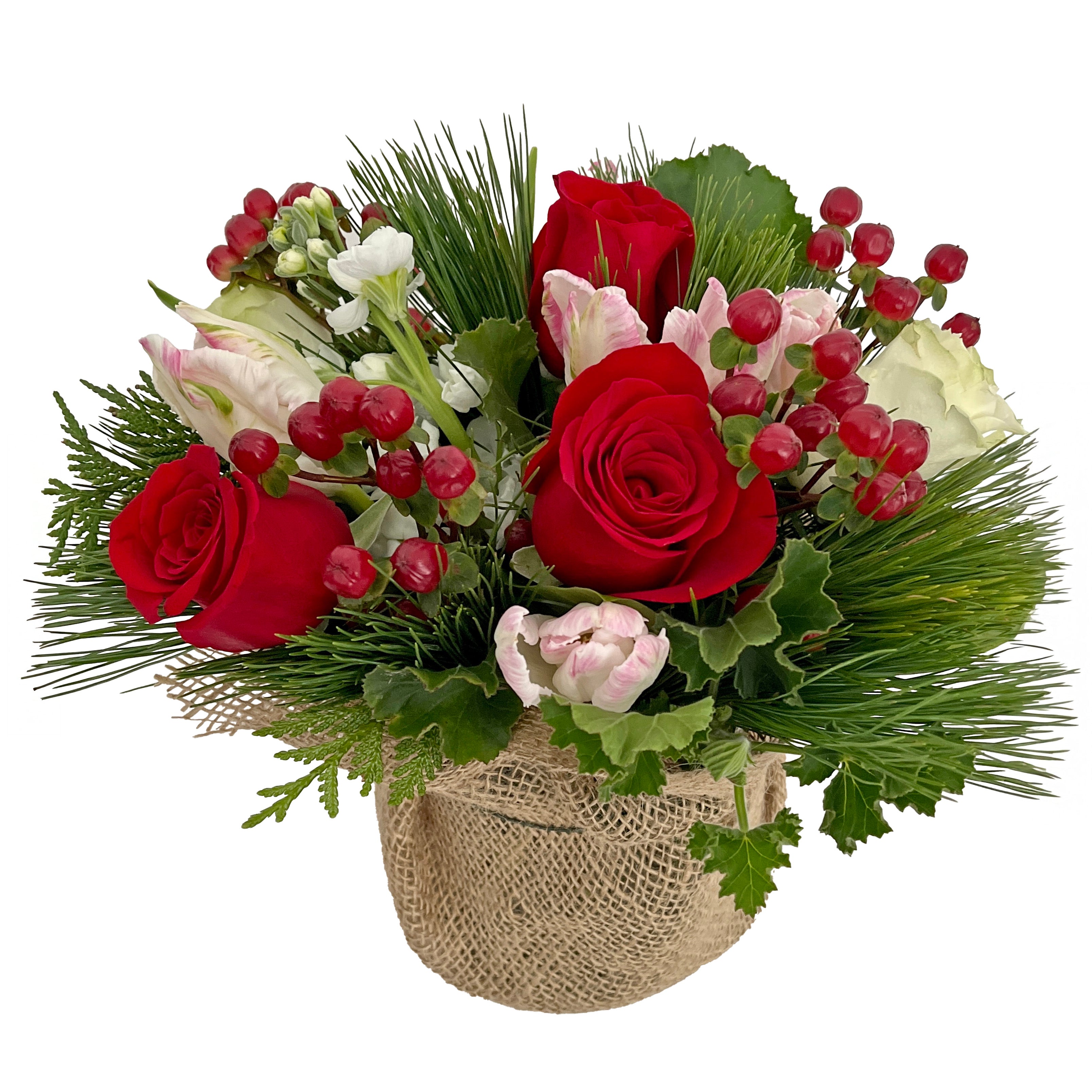 Mrs. Claus added her feminine touch to this Holiday arrangement of red and white roses with hypericum berries and pine by adding in some beautiful pink tulips. Burlap wrap on vase may be subbed with a green ti leaf when not available. (8'' tall and 8'' across)!