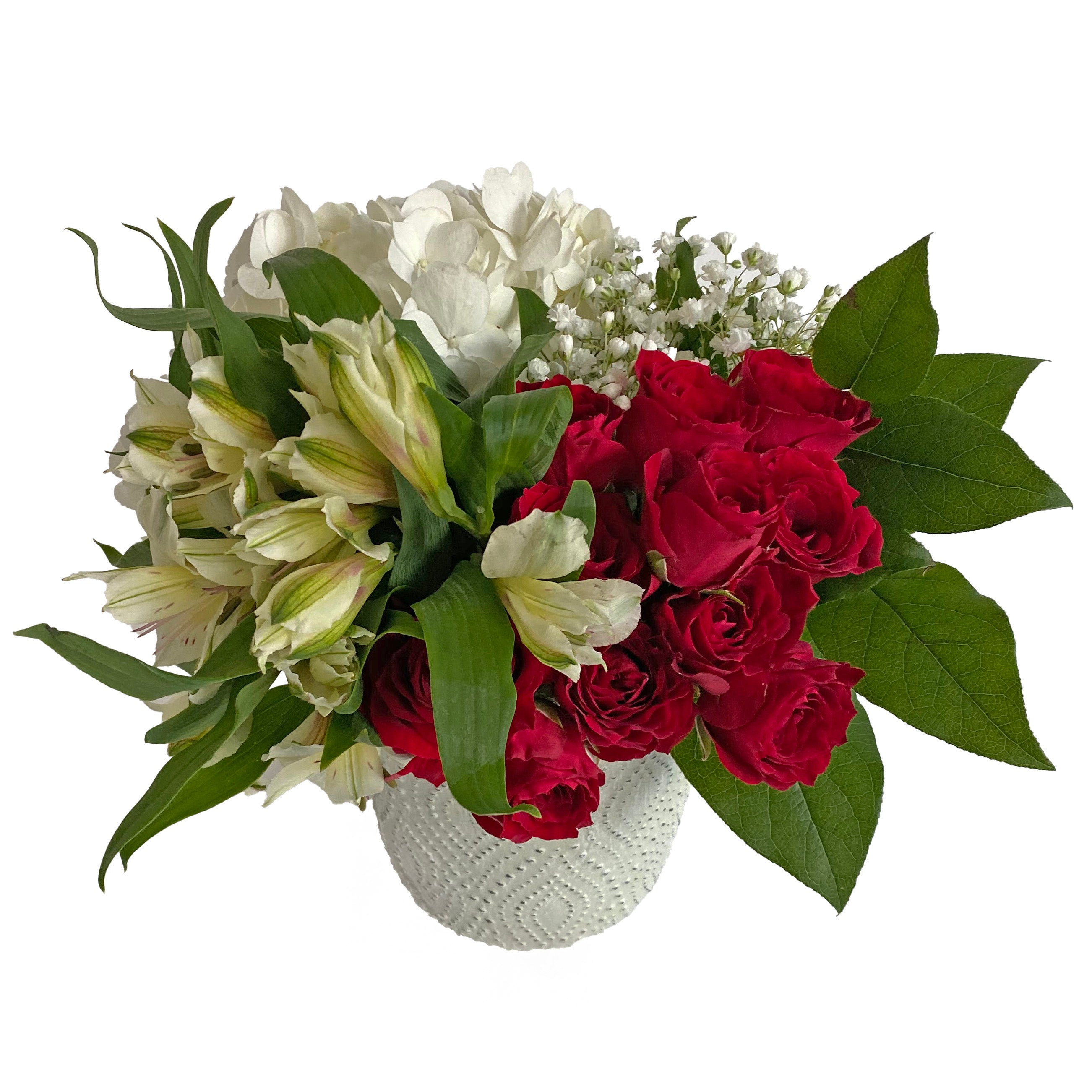 Beautiful red spray roses, white alstroemeria and hydrangea fill this gorgeous pave treat. perfect for the Holidays! (8'' tall and 8'' across) Vase is subject to change based on availability and upgrades may include other types of flowers.