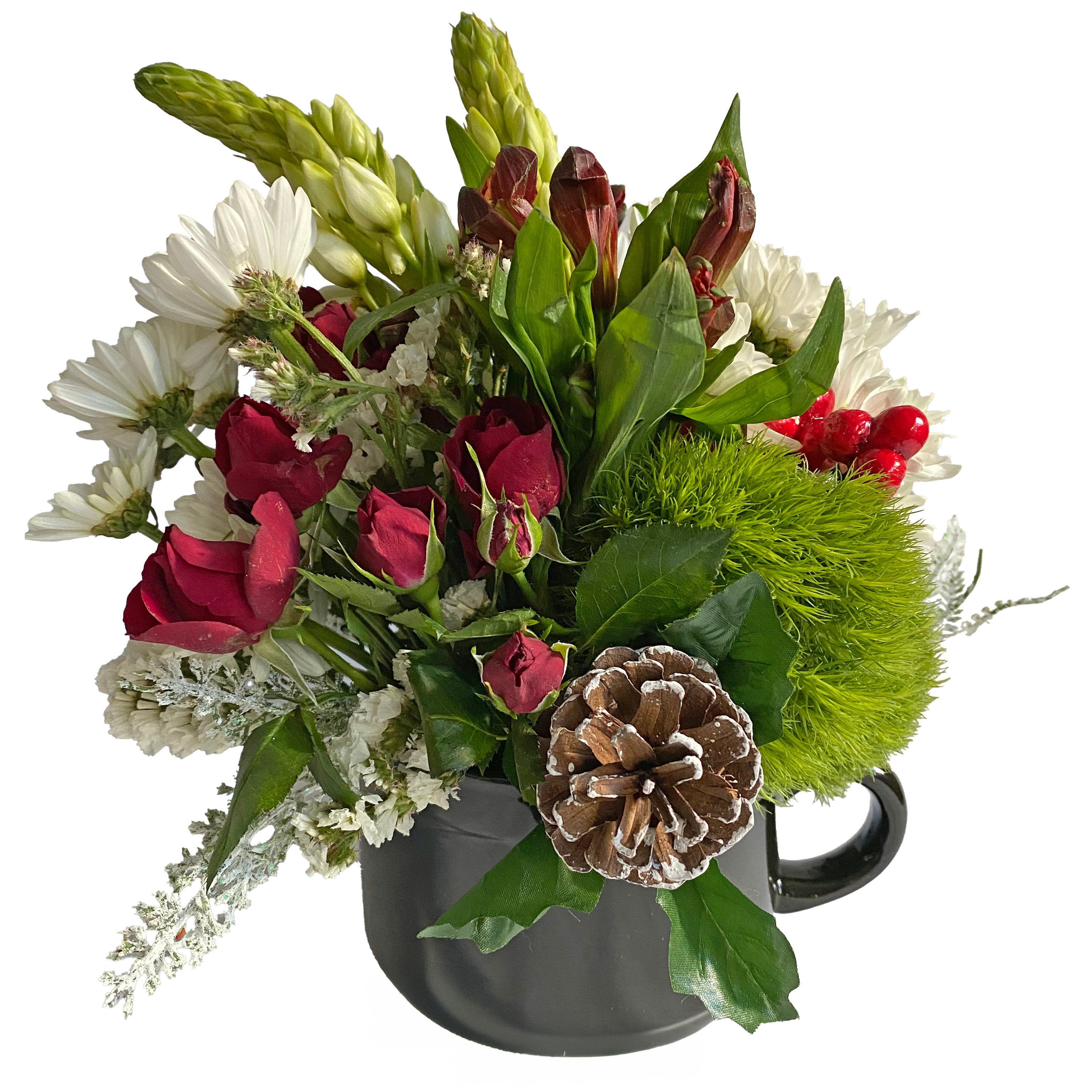 This mug is full of Christmas scents and colors with seasonal red, white and green flowers full of texture and accented with a pine cone. It's the greatest way to spread Holiday cheer to your friends, neighbors and co-workers (6" tall and 6" across)!