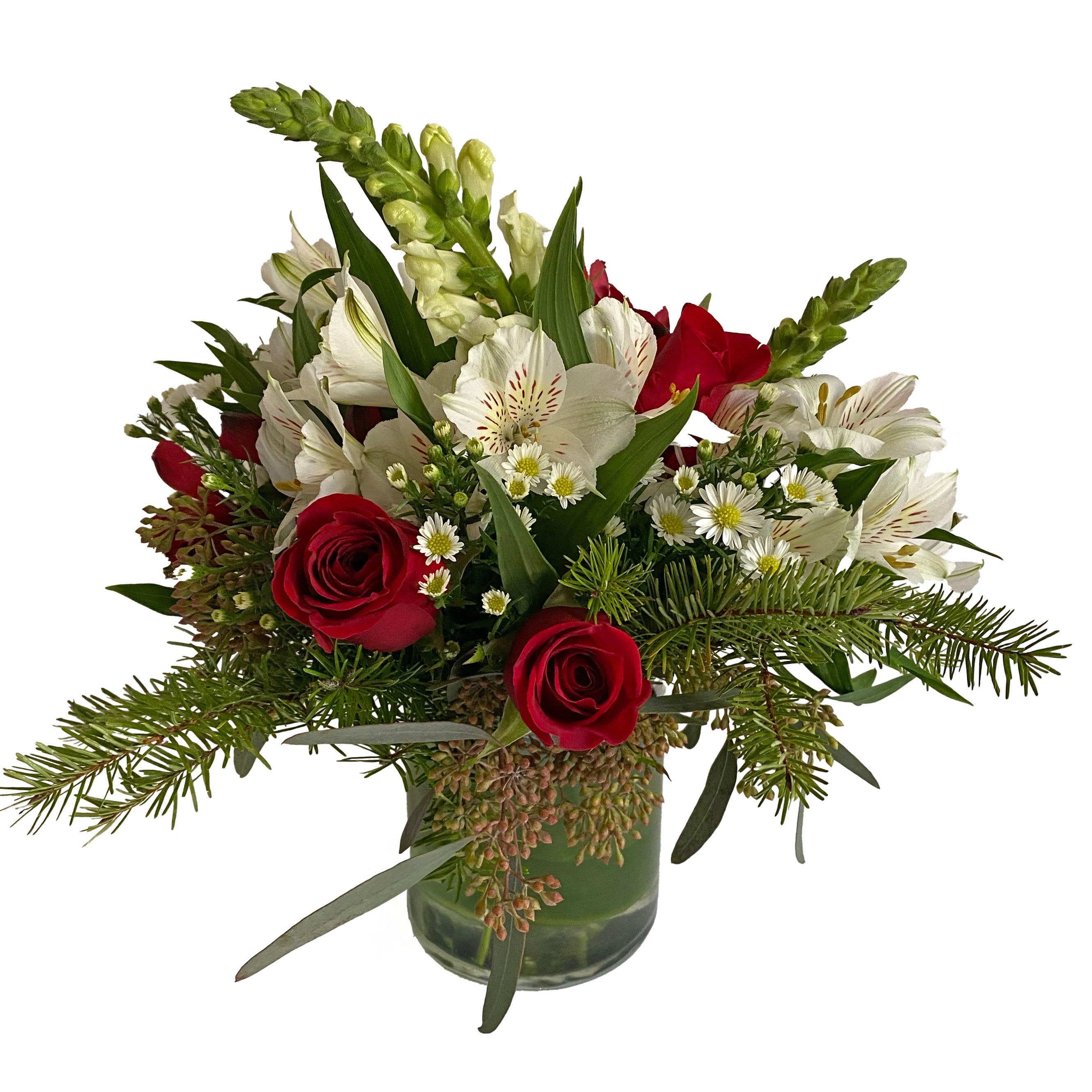 Bring on the holly 🎄 with this festive arrangement of red and white flowers of all sizes accented with evergreens and full of Holiday scents and wonders! (Approximately 8'' tall and 6'' across)