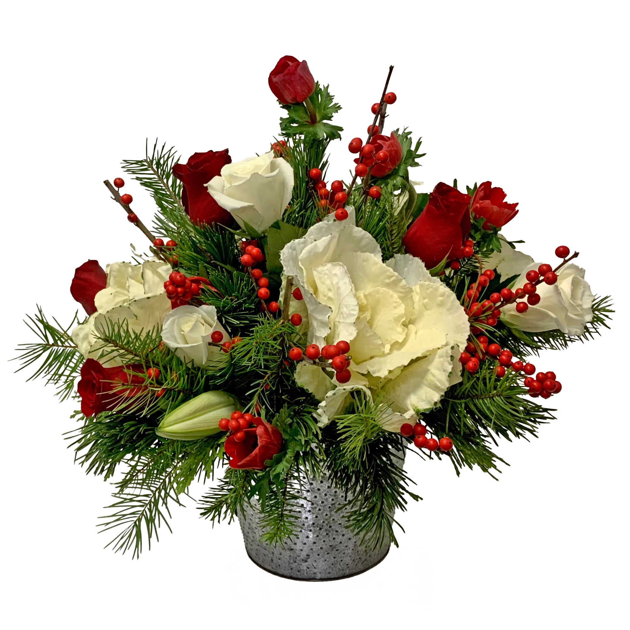 'Every time you hear a bell ring, an angel 👼🏻 gets its wings!'' As beautiful as an angel, this arrangement of roses, kale, tulips and ilex berries will capture the heart of the holidays and give off seasonal scents with with it's piney greens (12'' tall and 12'' across)! Specialty flowers like the kale may be replaced on same day orders.