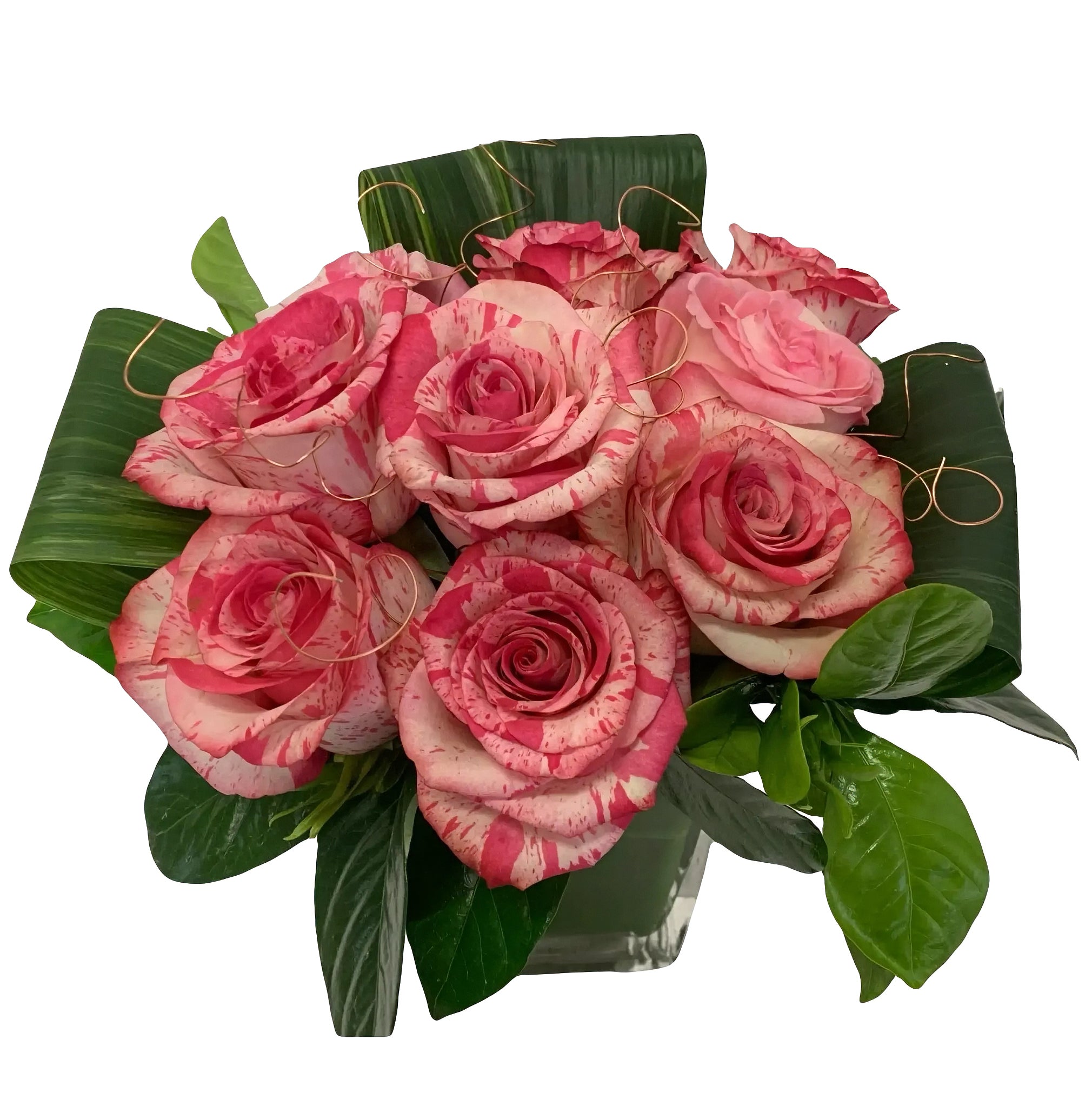 We love this cute little arrangement of intuition pink roses accented with wire curls! It's a modern take on roses, and while it may be small it sends a big message of LOVE (Approximately 6'' tall and 6'' across)! Intuition roses are subject to availability and will be subbed with a beautiful pink rose when not available.