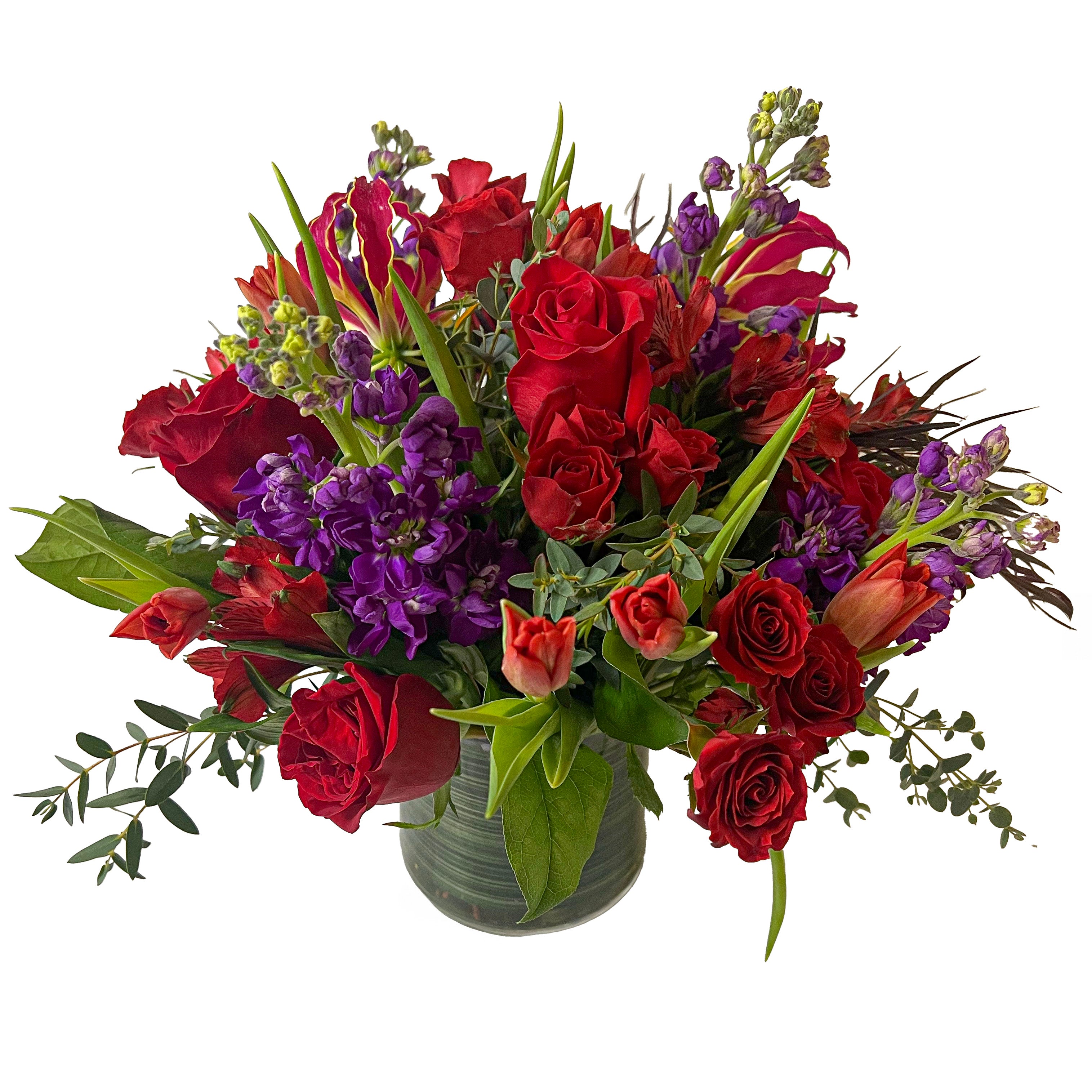 Romantic reds, pinks and purples blend together in this gorgeous arrangement of Texas seasonal flowers. It's flirty and fun and always changing! In February, we get the very special gloriosa lilies as seen in the picture, don't miss out on such an exquisite design in the month devoted to LOVE (Approximately 8'' tall and 6-8'' across)! The other 11 months of the year we will use other beautiful pink flowers in this mix for a piece sure to make your heart throb!!