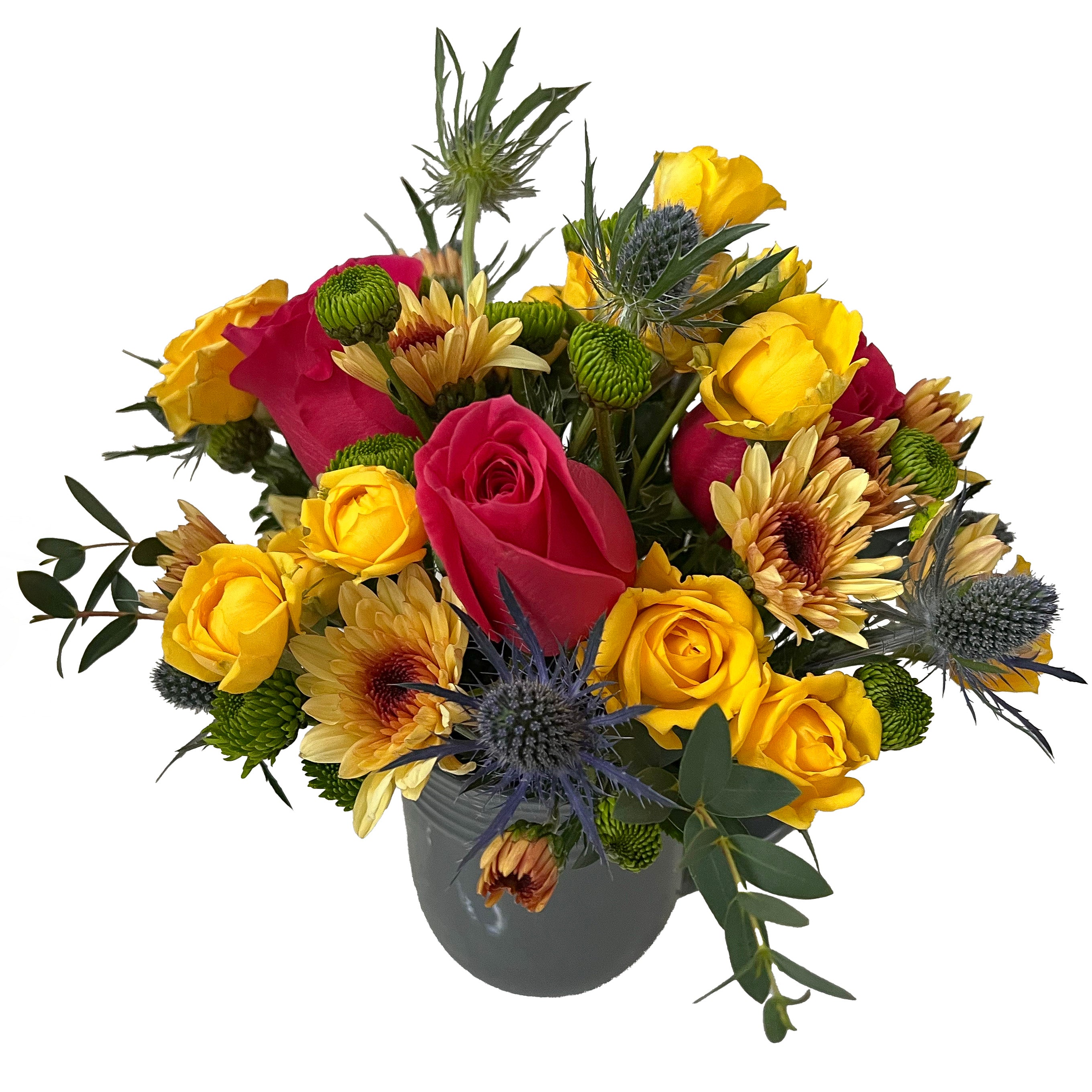 This cup arrangement of seasonal flowers is sure to bring joy to your loved as you let them know you are thinking of them or celebrating with them! (Approximately 8'' tall and 6'' across) coffee cup may vary