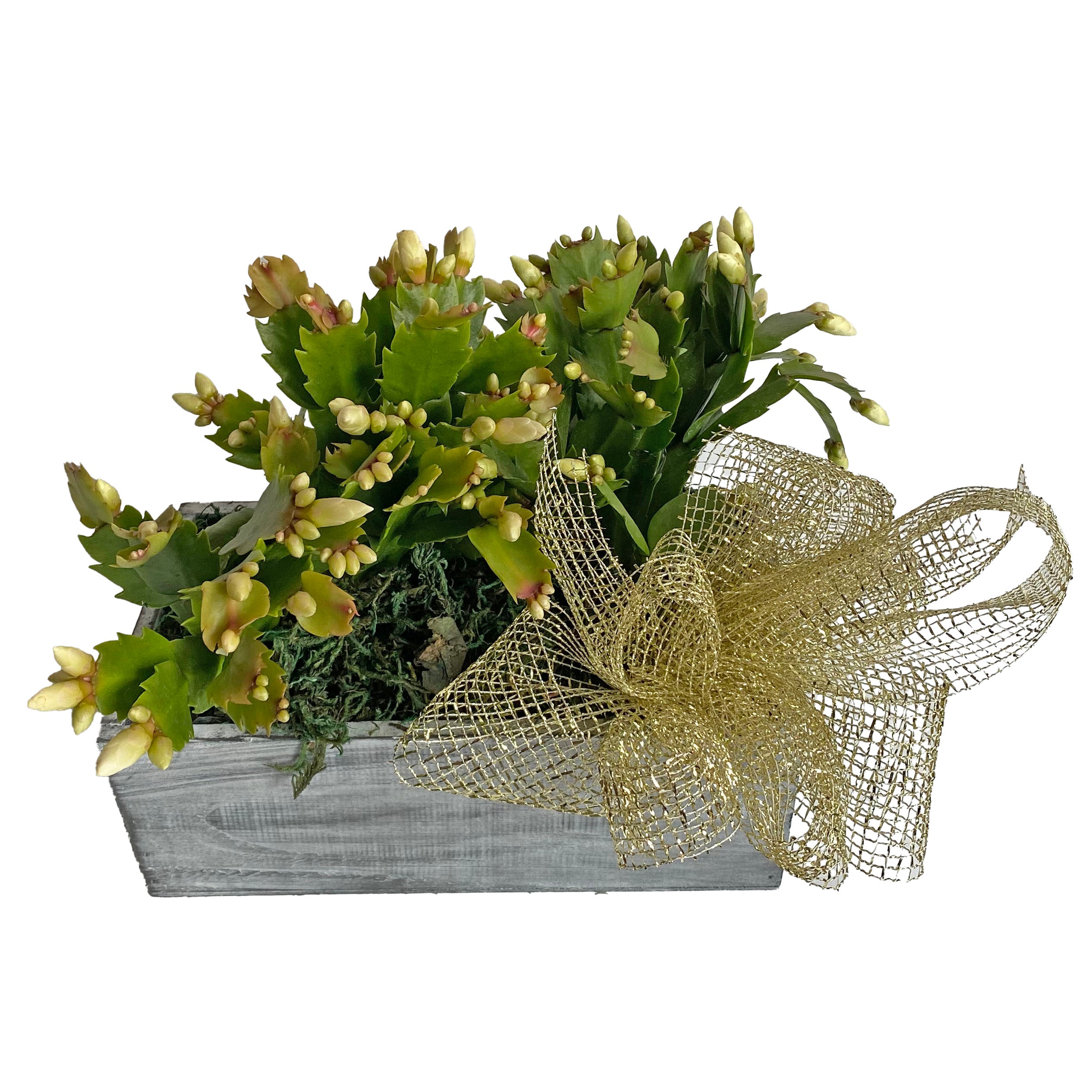 Beautiful blooming cacti with blossoms opening in late December fill this farmhouse planter with holiday cheer 🎅🏻! It also comes with a beautiful gold bow attached! (4" pot in a wooden box 9'' x 4") Please allow one day notice for delivery.