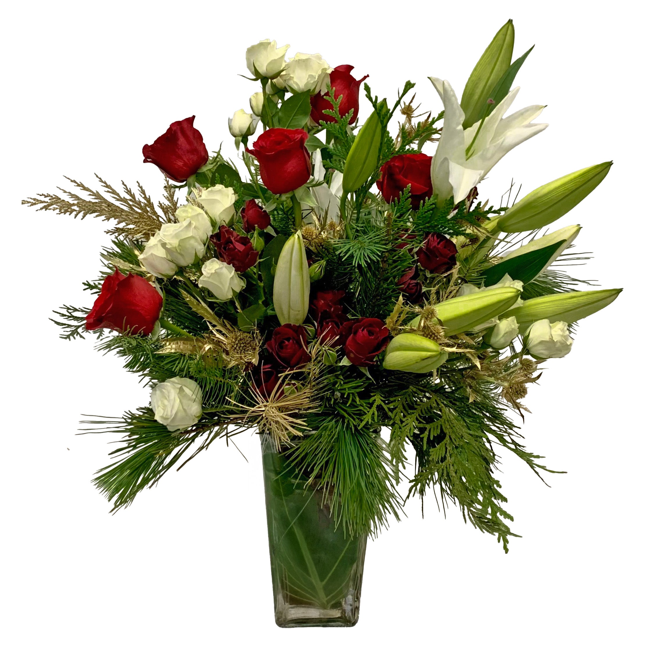 Blow up your Christmas with this large floral arrangement bursting with all the scents of the season! It's packed full of lilies and roses in our favorite colors for the Holiday, red, white and green (18" tall and 15" across)!