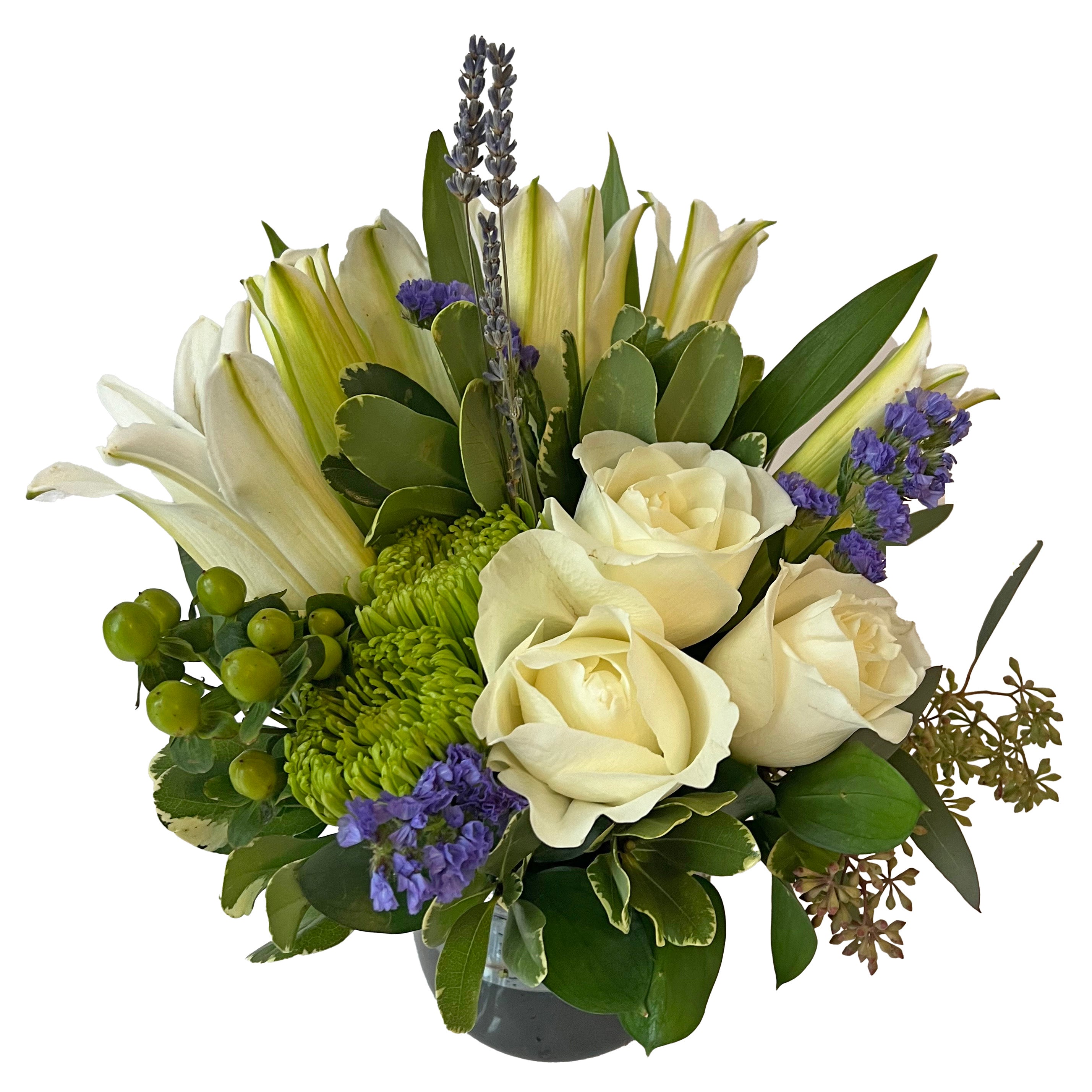 A classic mix of white and green cut florals fill this arrangement with stunning textures and a touch of lavender for soothing sentiments! (8" tall and 8"across)