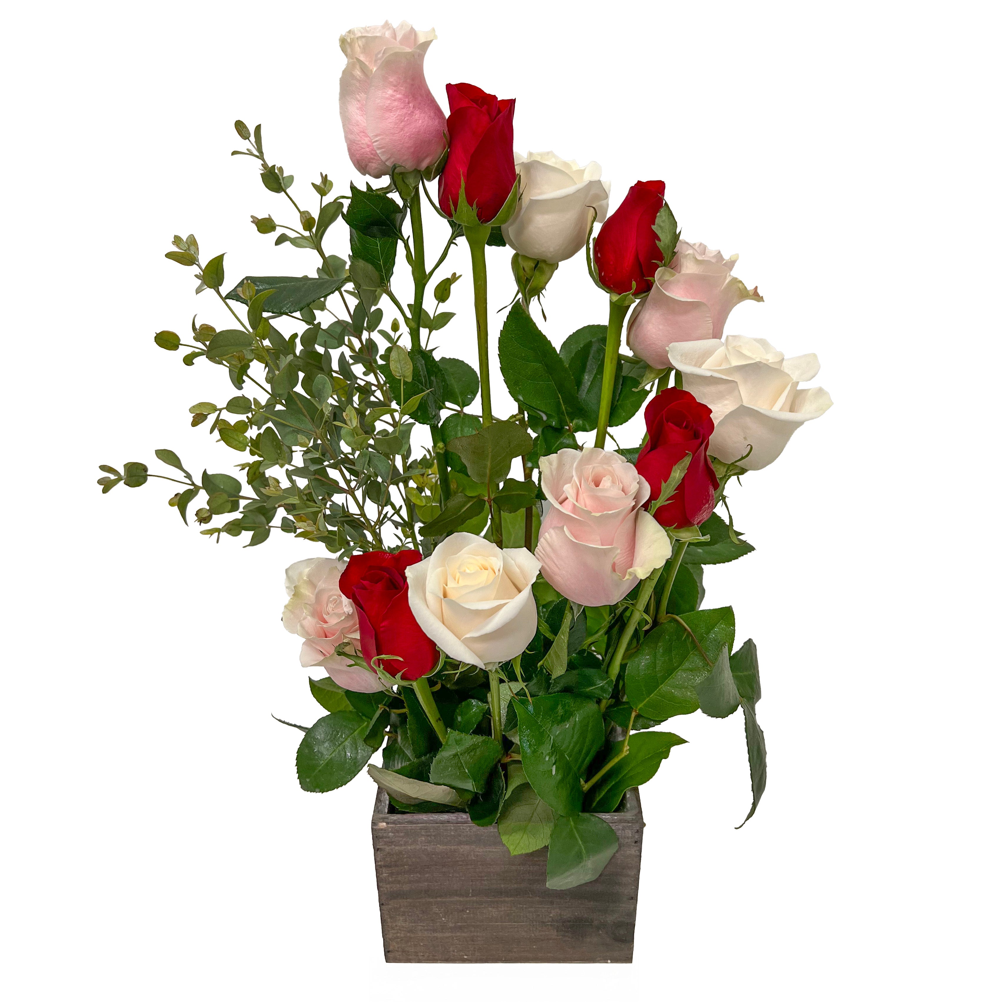This twist on one of our most beloved arrangements takes Valentine Love to a whole new level! Our classic spiral of roses becomes of trio of colors including red, pink and white roses. If you are looking for something different to show your love, this is it (15'' tall and 9'' across)!