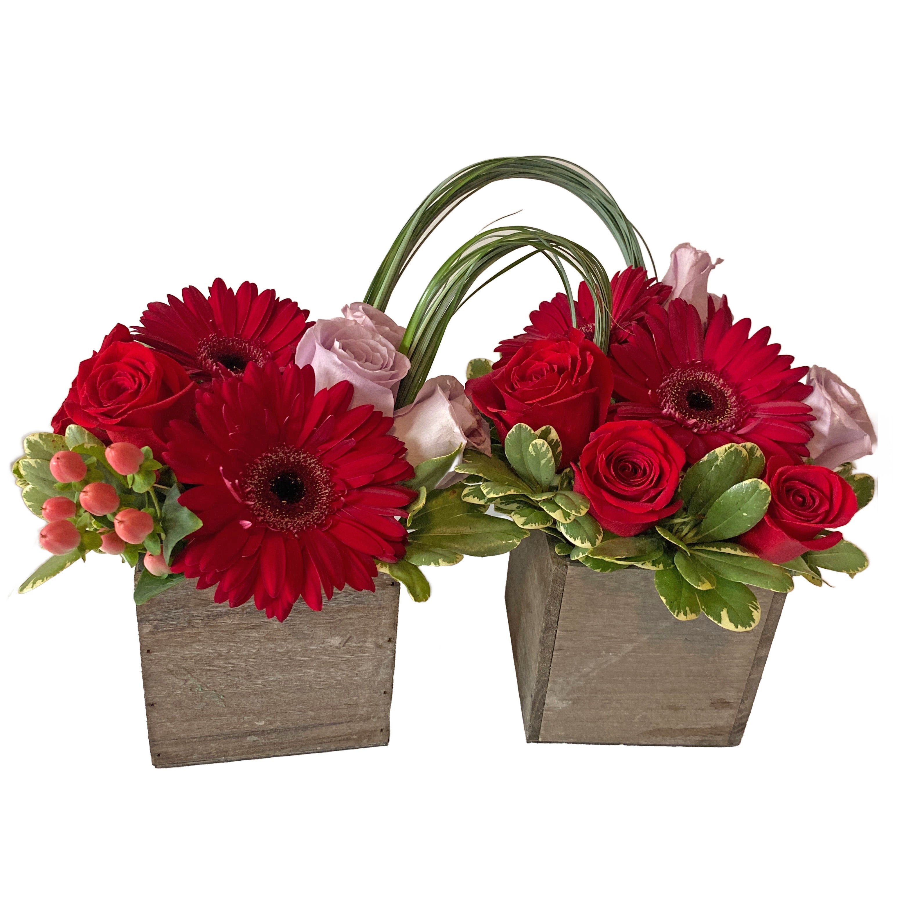 Truly unique this arrangement of gerbera daisies and roses in two vases attached with bear grass is unlike any other you'll find in San Antonio (8'' tall and 18'' across)! It's a great low and long centerpiece for your Thanksgiving table!
