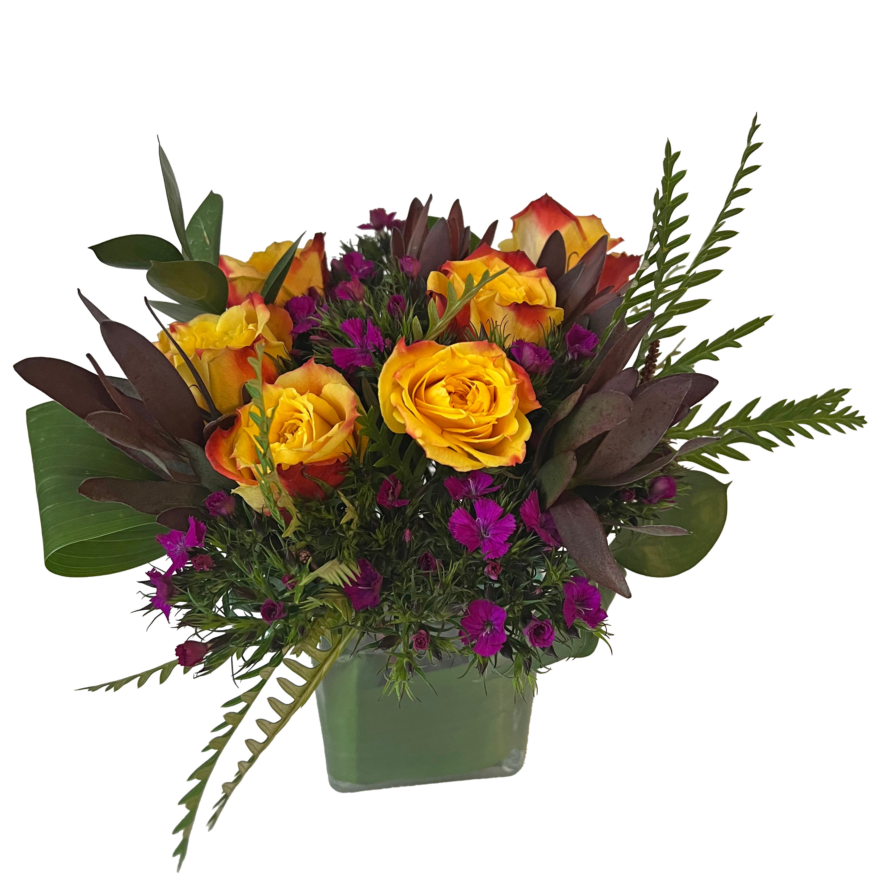 Gorgeous High Magic Roses, Purple Gypsy Dianthus and Dark Safari Sunset make this a simple, but stunning arrangement perfect for fall or all things spooky (8'' tall and 8'' across)!