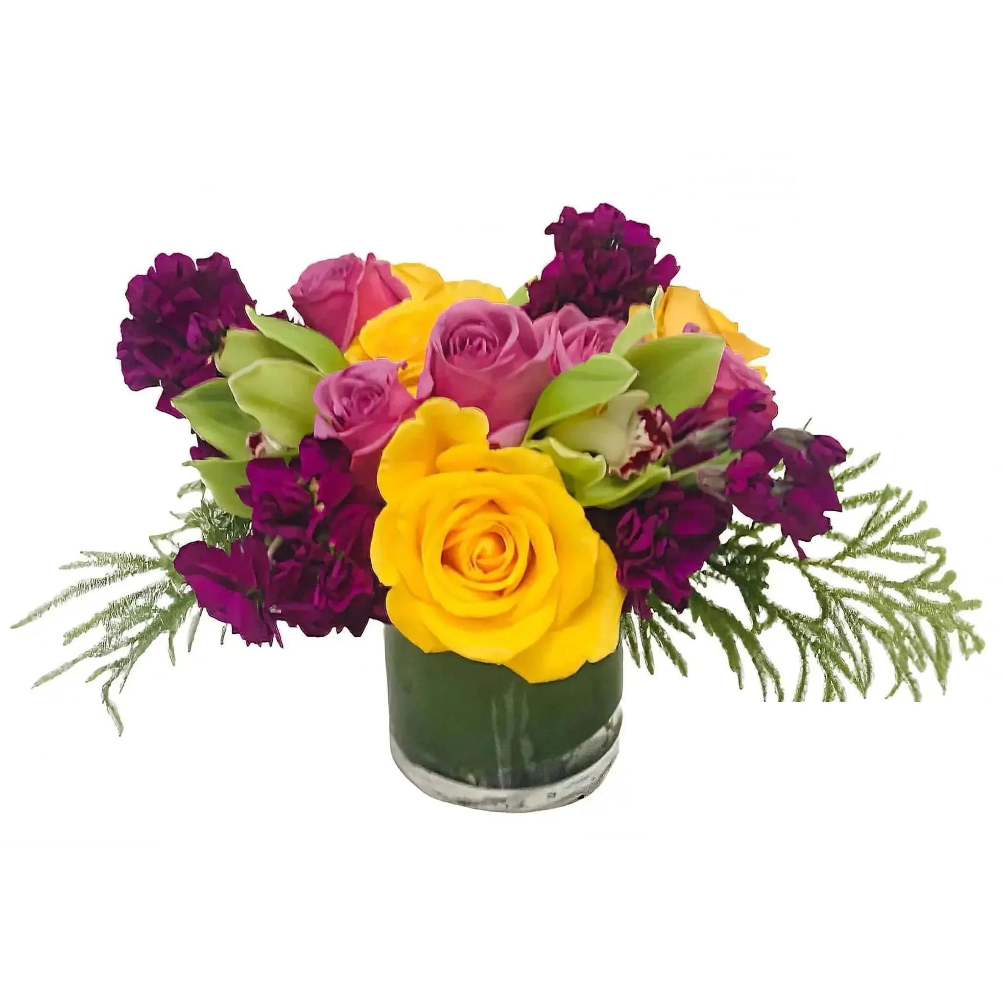 Simple elegance is captured in this arrangement of Purple and Yellow Roses, Purple Stock and Green Cymbidium Orchids. It's bright and cheery enough to turn a bad day into something happy (8'' tall and 8'' across)!