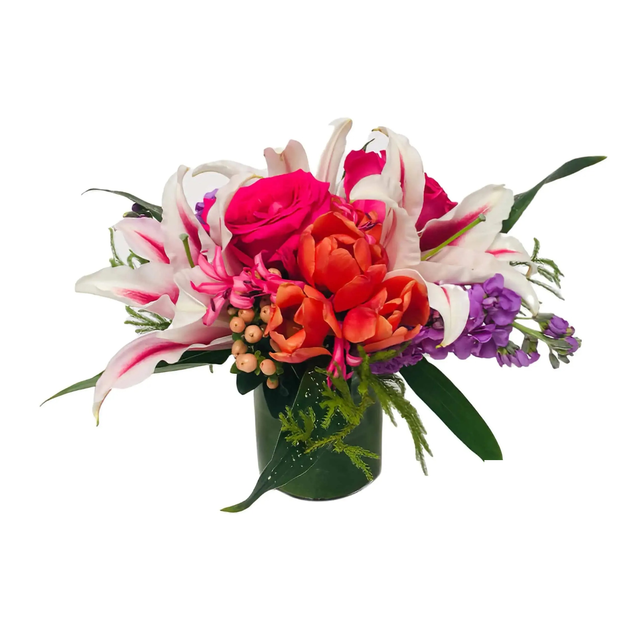 My memories of Santa Margherita, Italy are perfectly captured in this brightly colored arrangement of seasonal garden flowers including stargazer lilies, tulips, roses, and stock (8'' tall and 8-9'' across). Bring some bright colors into your life and a smile will grow!