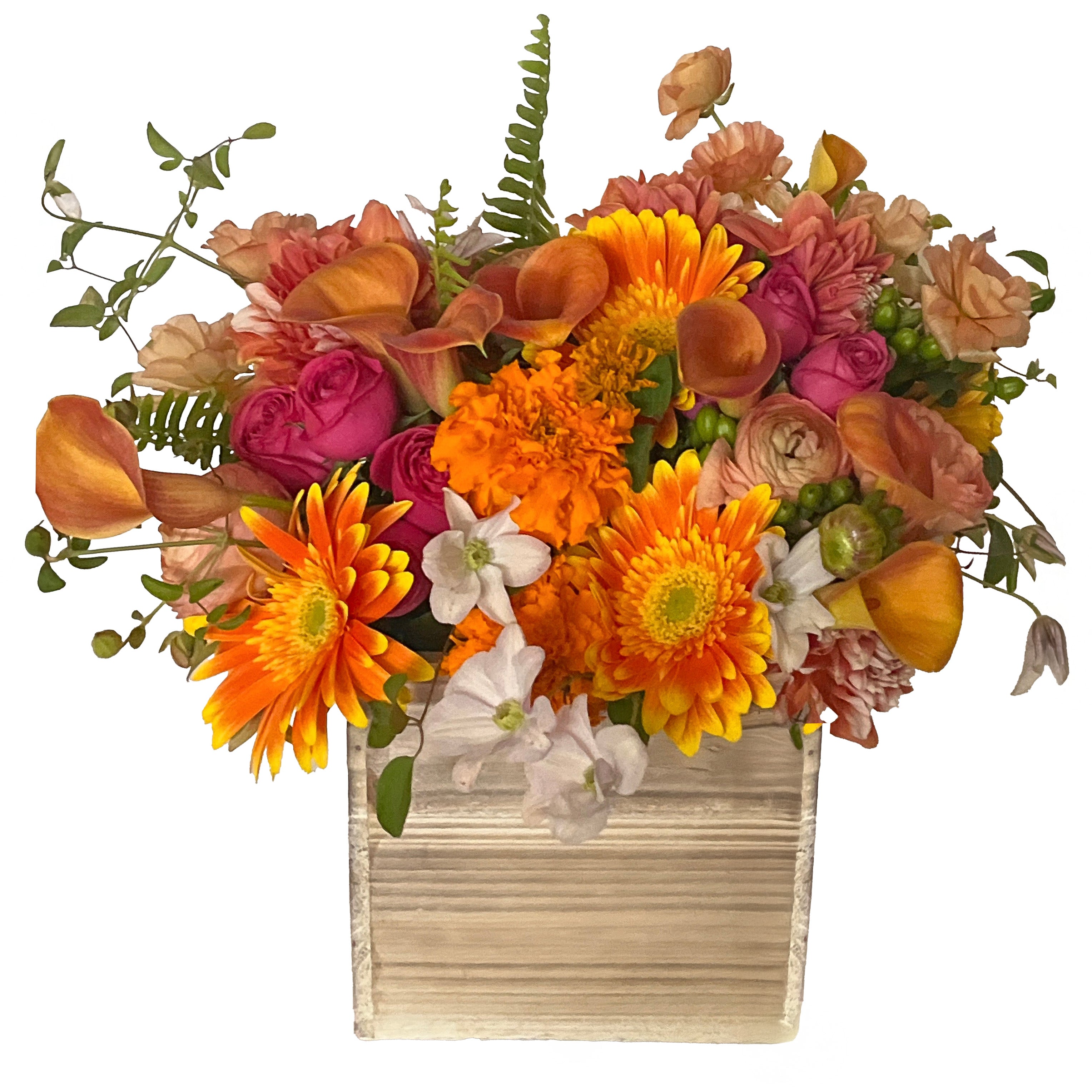 Gonna move into the country and buy some peachy flowers! This box of orange, peach and pink seasonal flowers is sure to please just like a great slice of peach cobbler! This is one of our happiest mixes of flowers sure to delight any recipient (Approximately 9" tall and 8" across)! Upgrades may change the box to a vase to accommodate the extra flowers.