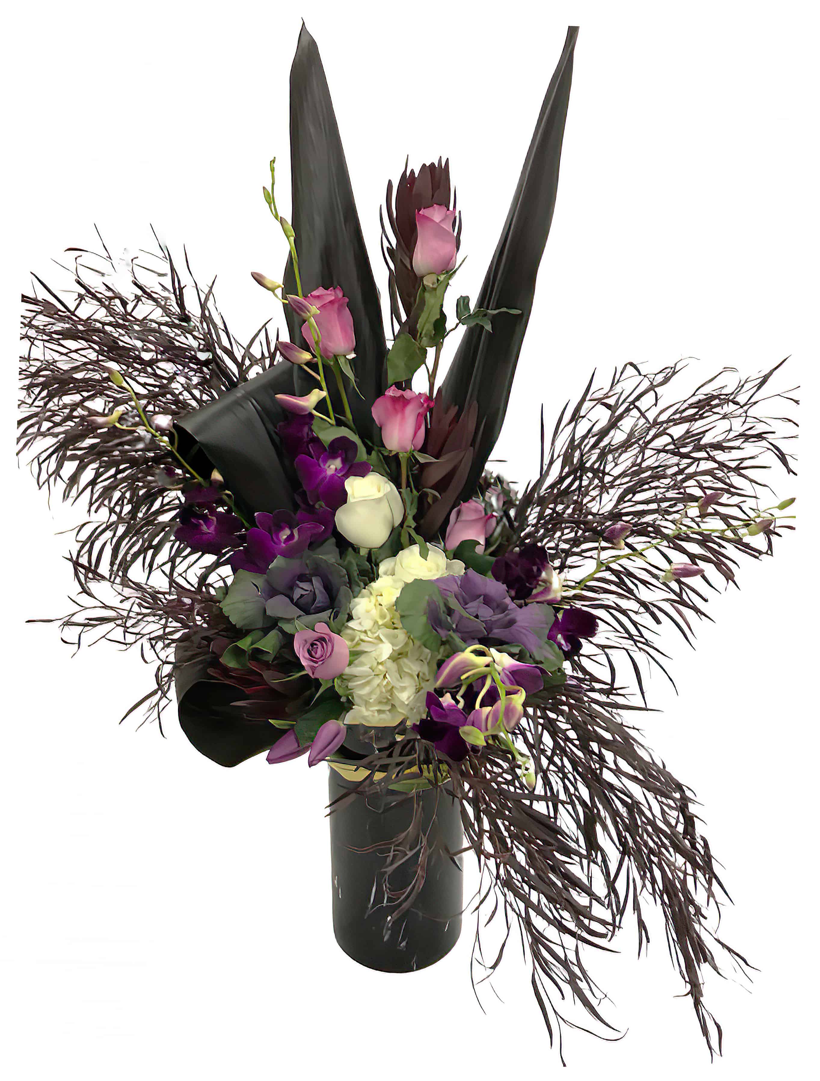 This gorgeous lavender arrangement of flowers grasps beauty at each level with kale, orchids, hydrangea, roses and feathers of agonis (24-28'' tall and 15-18'' across)!