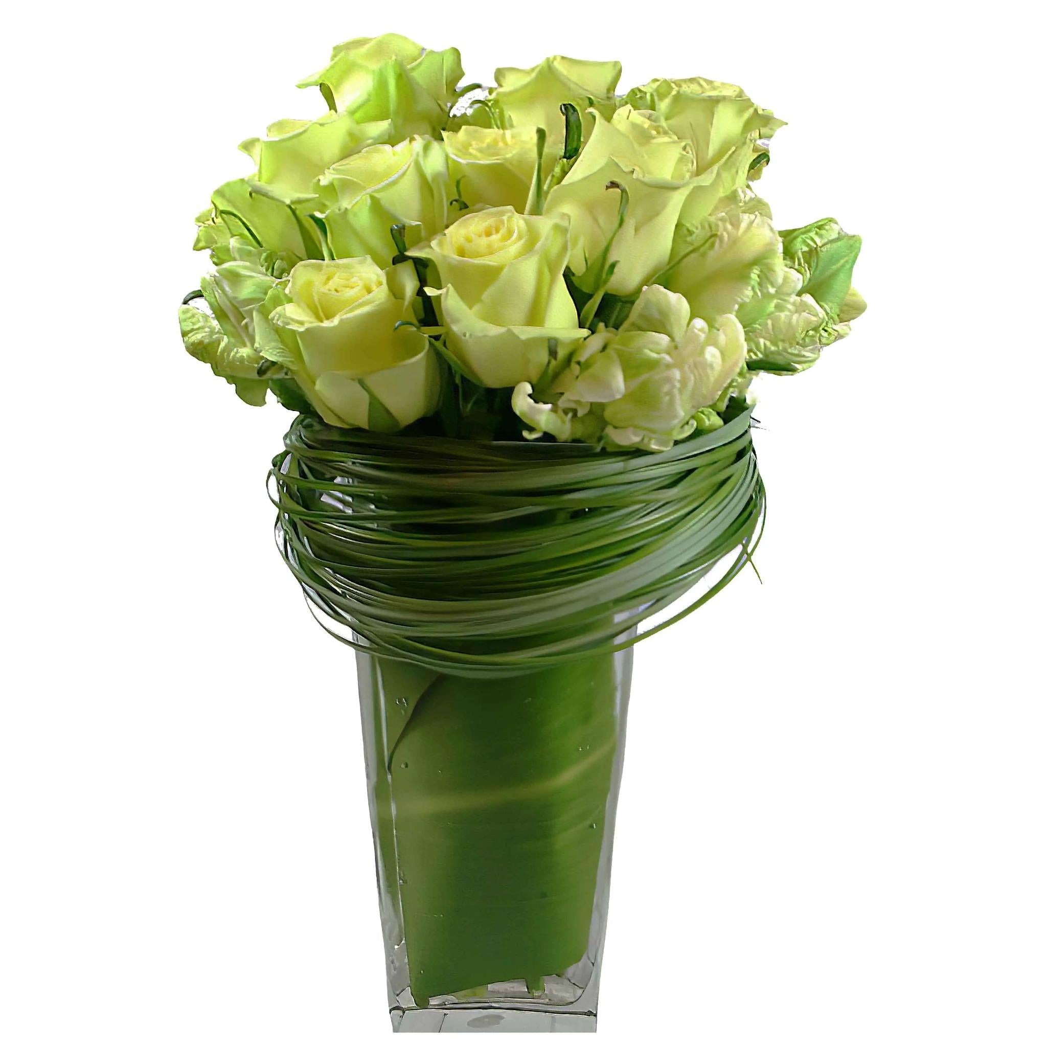 This ravishing arrangement of Roses and Tulips is set in a glass vase lined and topped off with a sphere of Bear Grass. It brings back elegance with a modern twist (12'' tall and 5-6'' across)!