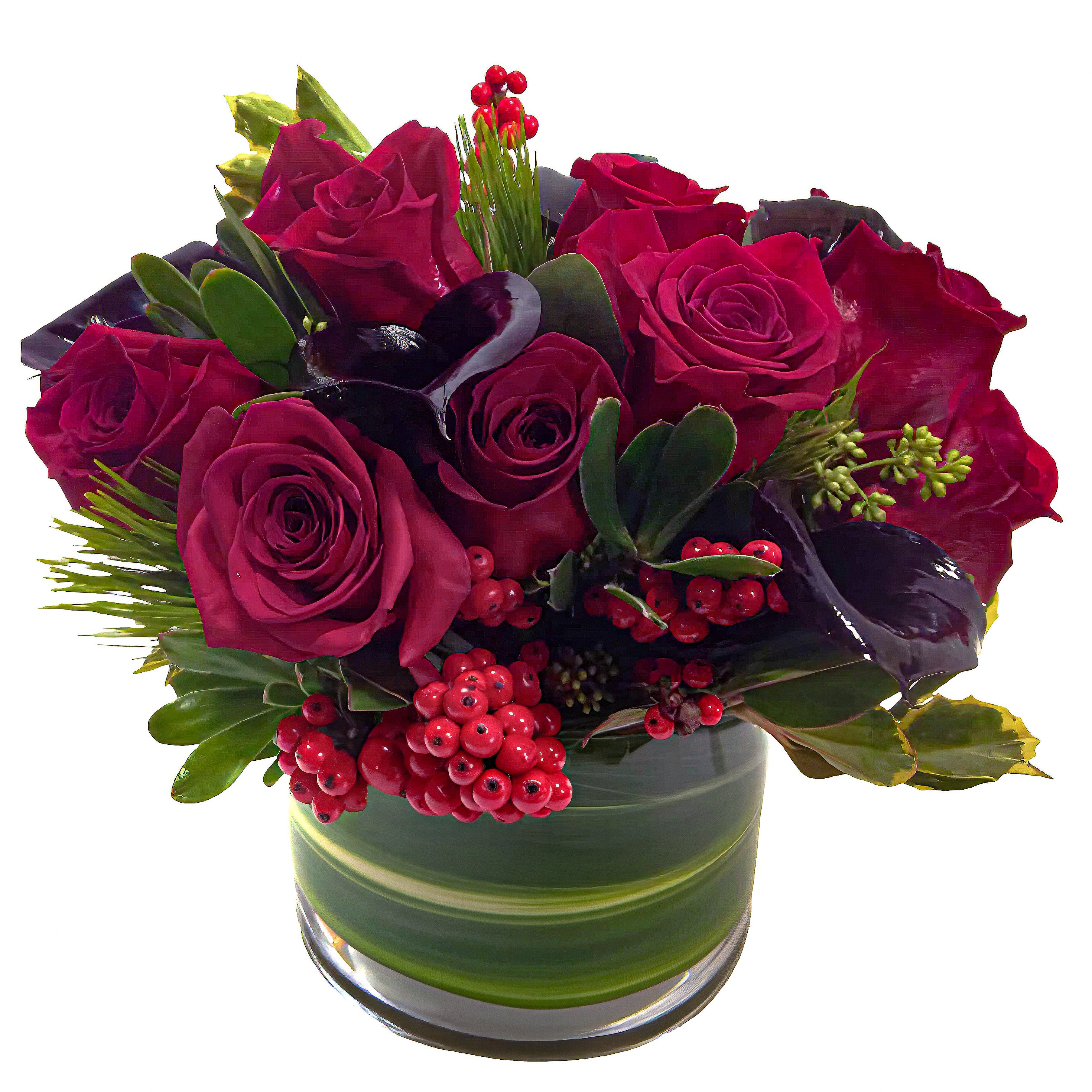 This gorgeous design of roses and dark calla lilies are sure to lure love 🖤 into any relationship. The Christmas greens and berries make it the perfect holiday gift for that special someone (8'' tall and 8'' across). Upgrades on this arrangement may include other types of flowers in the same color scheme.