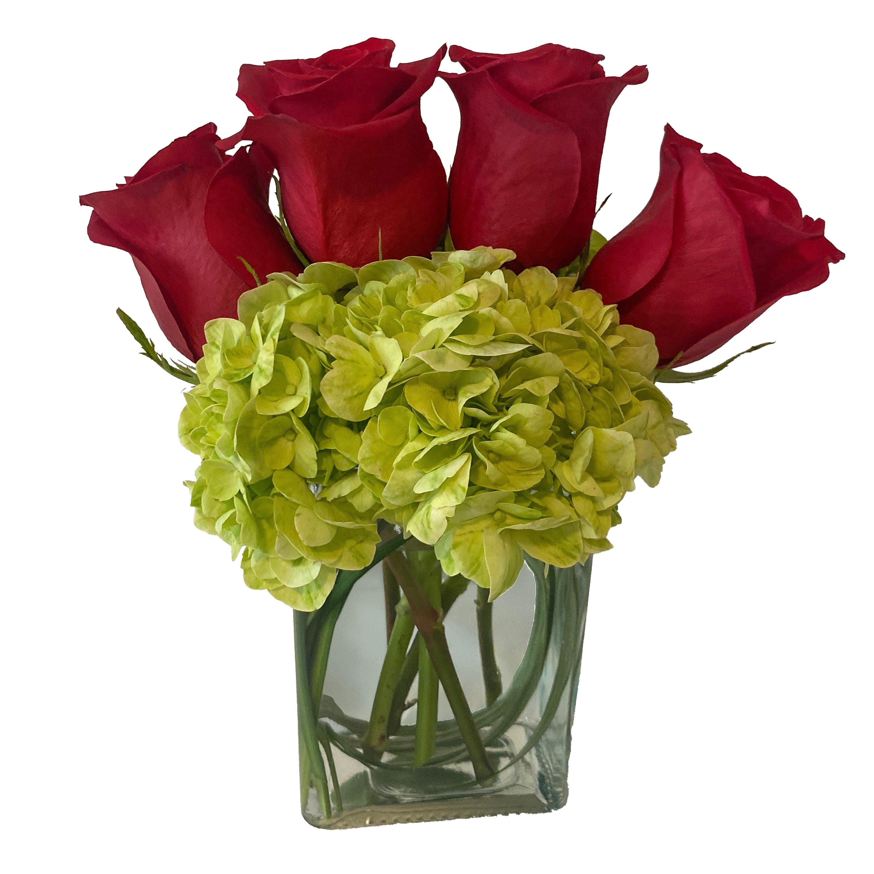 The art of flirting is intentional small acts of romance and this arrangement of Red Roses and green hydrangea was designed specifically for that! Show your skills at flirting with this arrangement that your special someone is sure to love (9'' tall and 5'' across)!