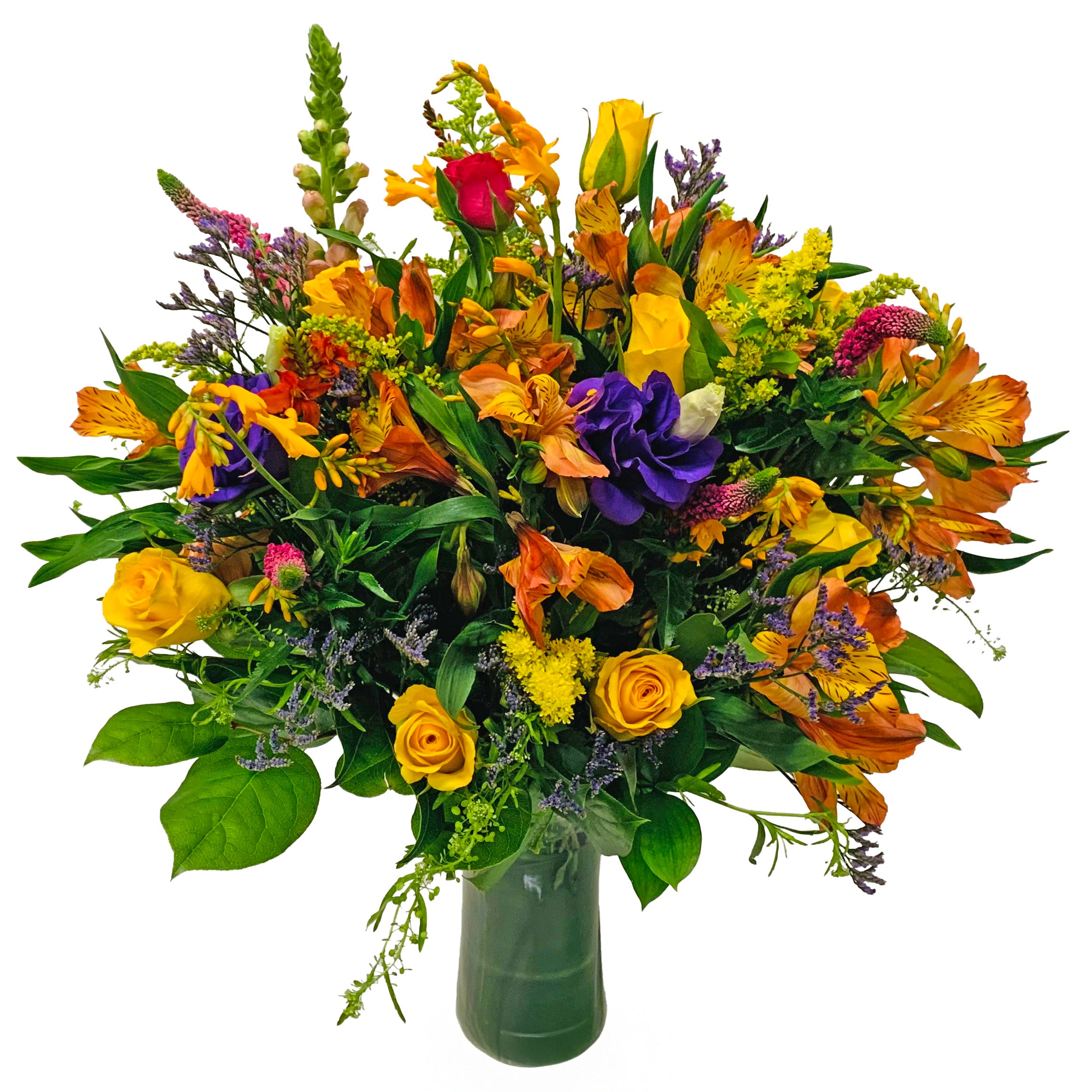 A truly colorful and bright floral arrangement just like Rainbow Bright and her friends. It's bursting with all kinds of garden flowers from Snapdragons and roses to calla lilies and alstroemeria. It's sure to bring happiness, forgiveness or fun to your recipient or next party (24" tall and 24" across)!