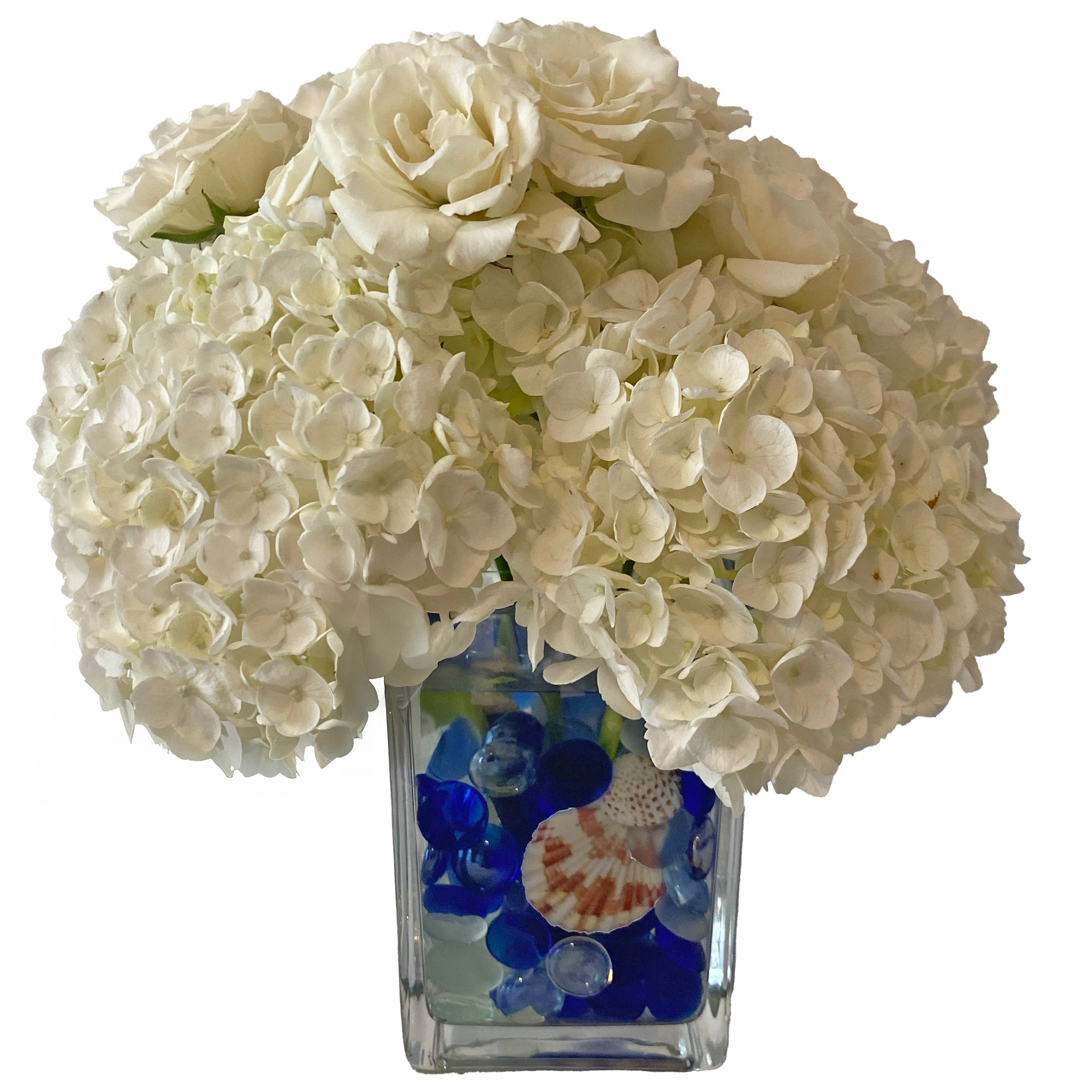 A unique and refreshing way to share the beach with someone you love! This arrangement of Hydrangea and Spray Roses is set in a rectangular vase filled with shells and blue rocks (8'' tall and 6'' across).