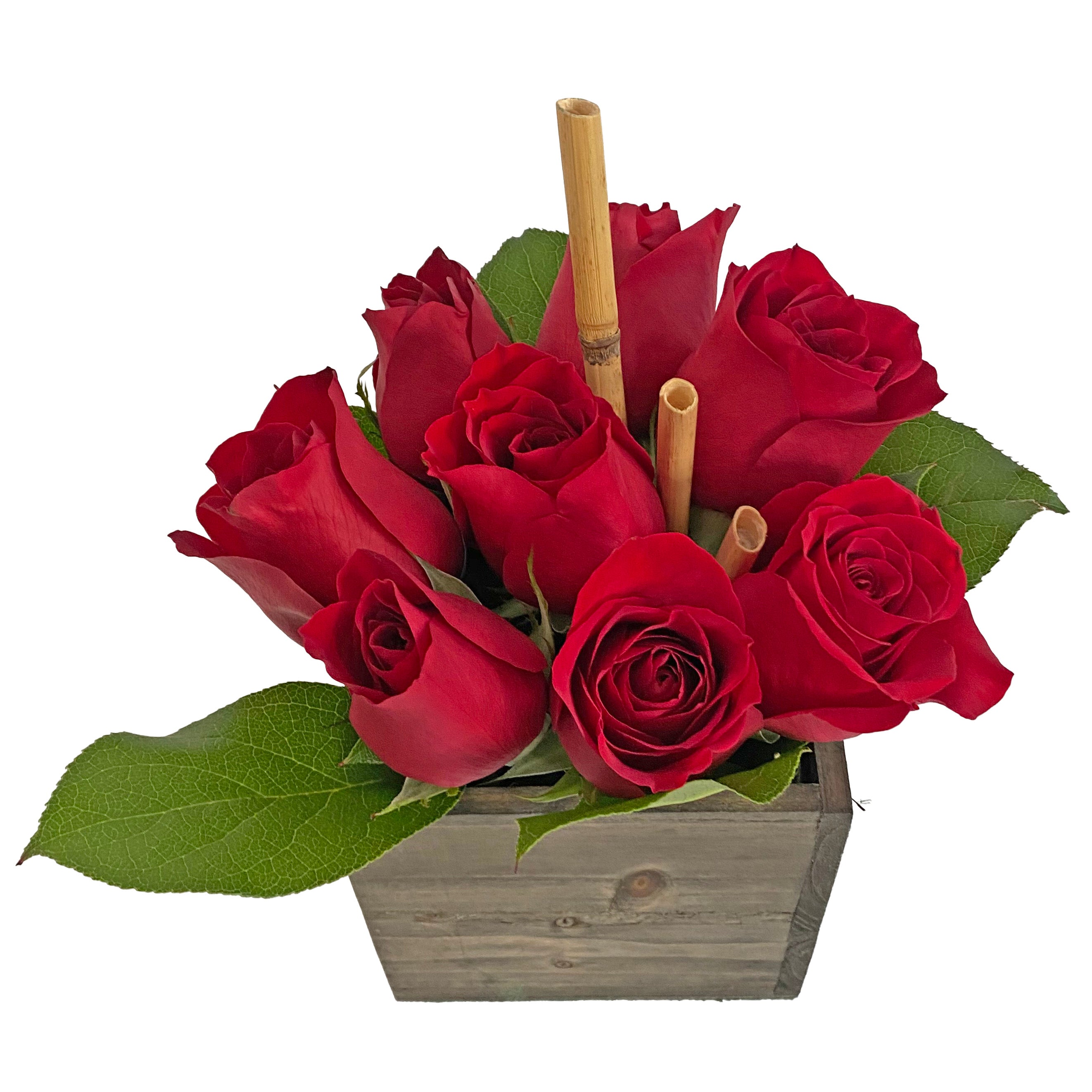 This small arrangement packs a big punch with beautiful red roses capturing all the attention in a square vase accented with river cane (7'' tall and 5" across).
