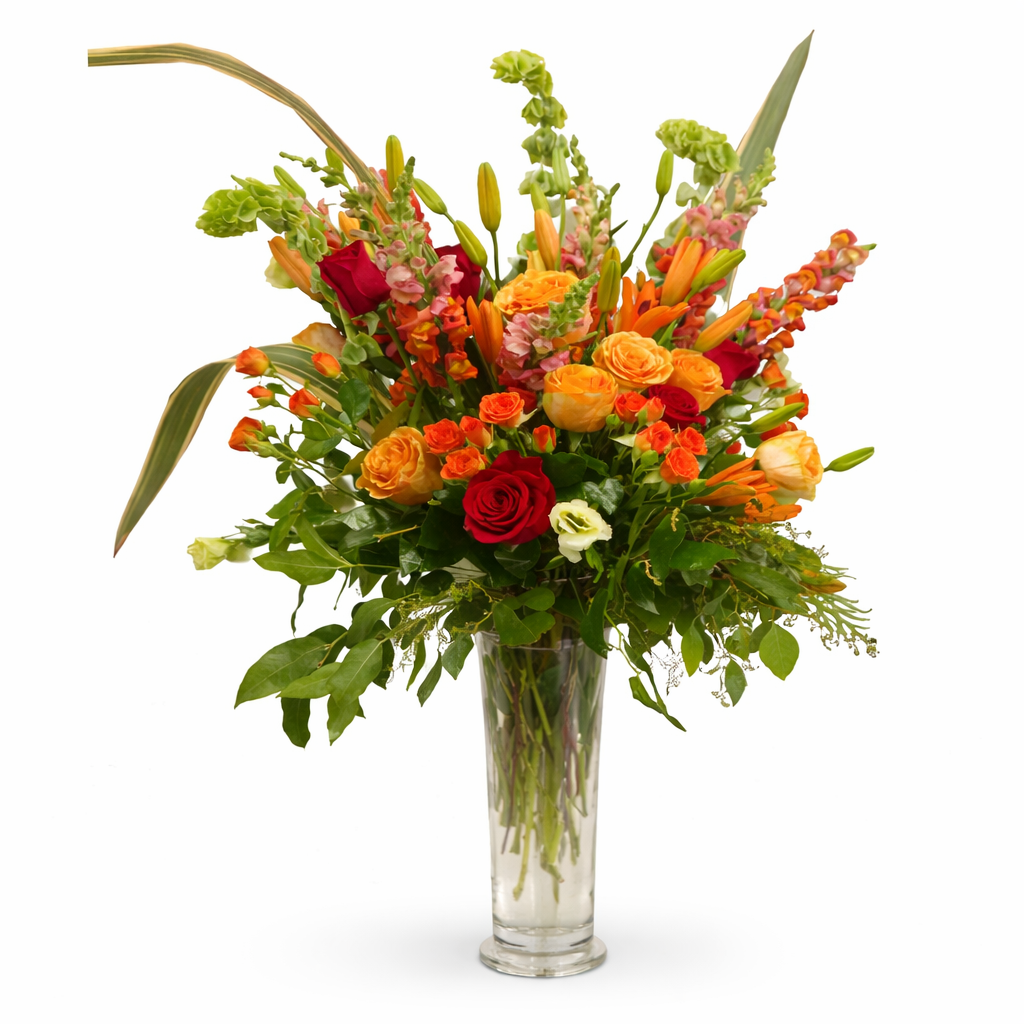 Celebrate a momentous occasion with this tall, gorgeous flower arrangement of warm-colored Roses, Lilies, Snap Dragons, and Greens in a tall glass vase (30-36'' tall and 20-24'' across). The vase shown is subject to availability and how far it's traveling.