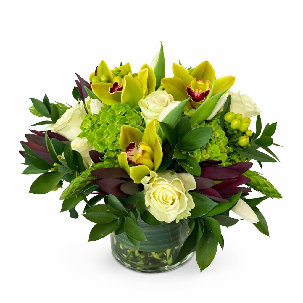 Beautiful white roses and green orchids are highly contrasted with dark safari sunset for a very classic pave floral arrangement, perfect for any room or any occasion (8" Tall and 8'' Across).