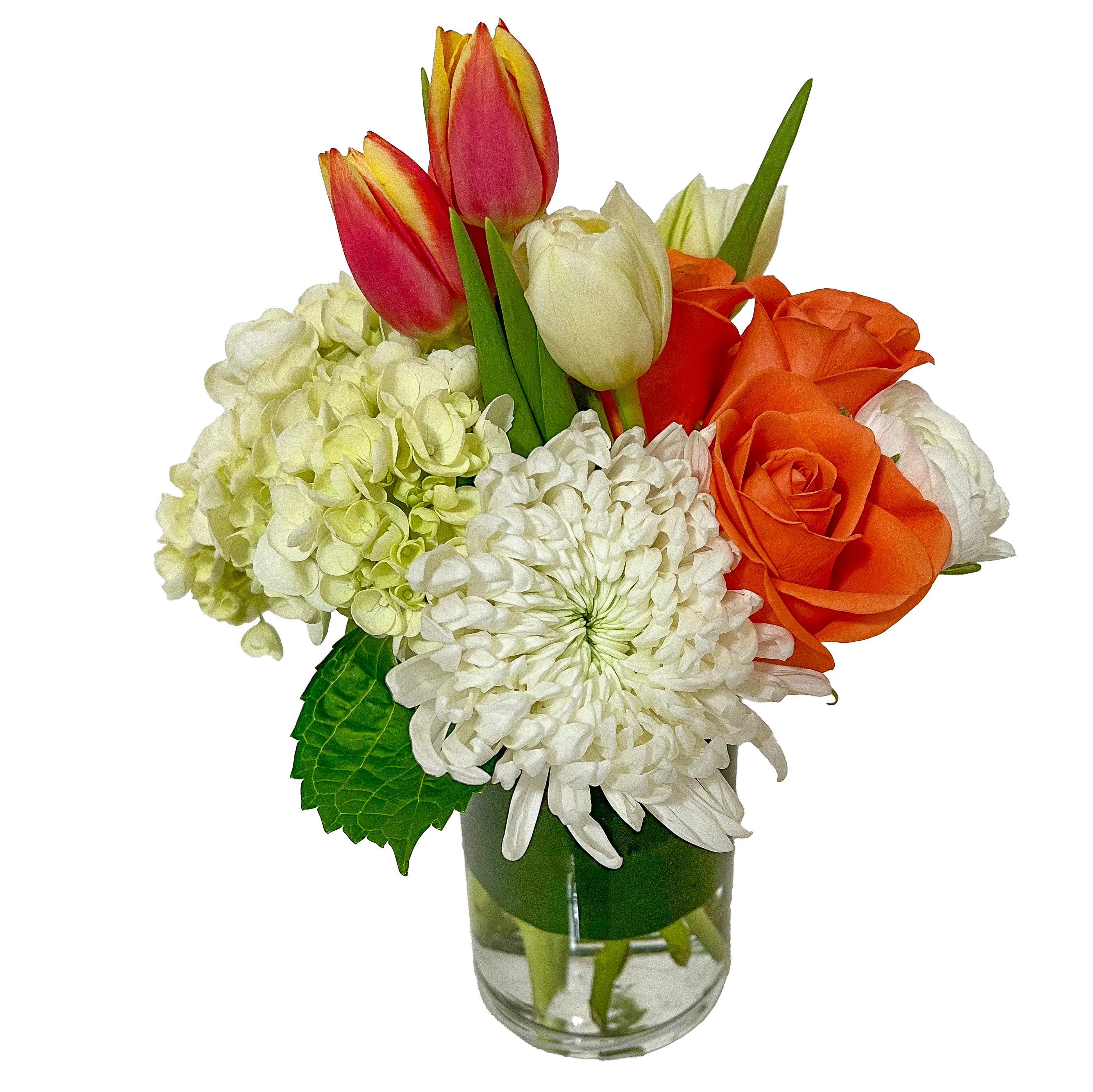 Rich orange roses and tulips steal the show in this warm colored mix of flowers. The big beautiful football mum and white hydrangea complete the feel of the grove. It's the perfect gift to cheer someone up or show your appreciation. Tulips will be substituted when out of season (10'' tall and 6'' across)!