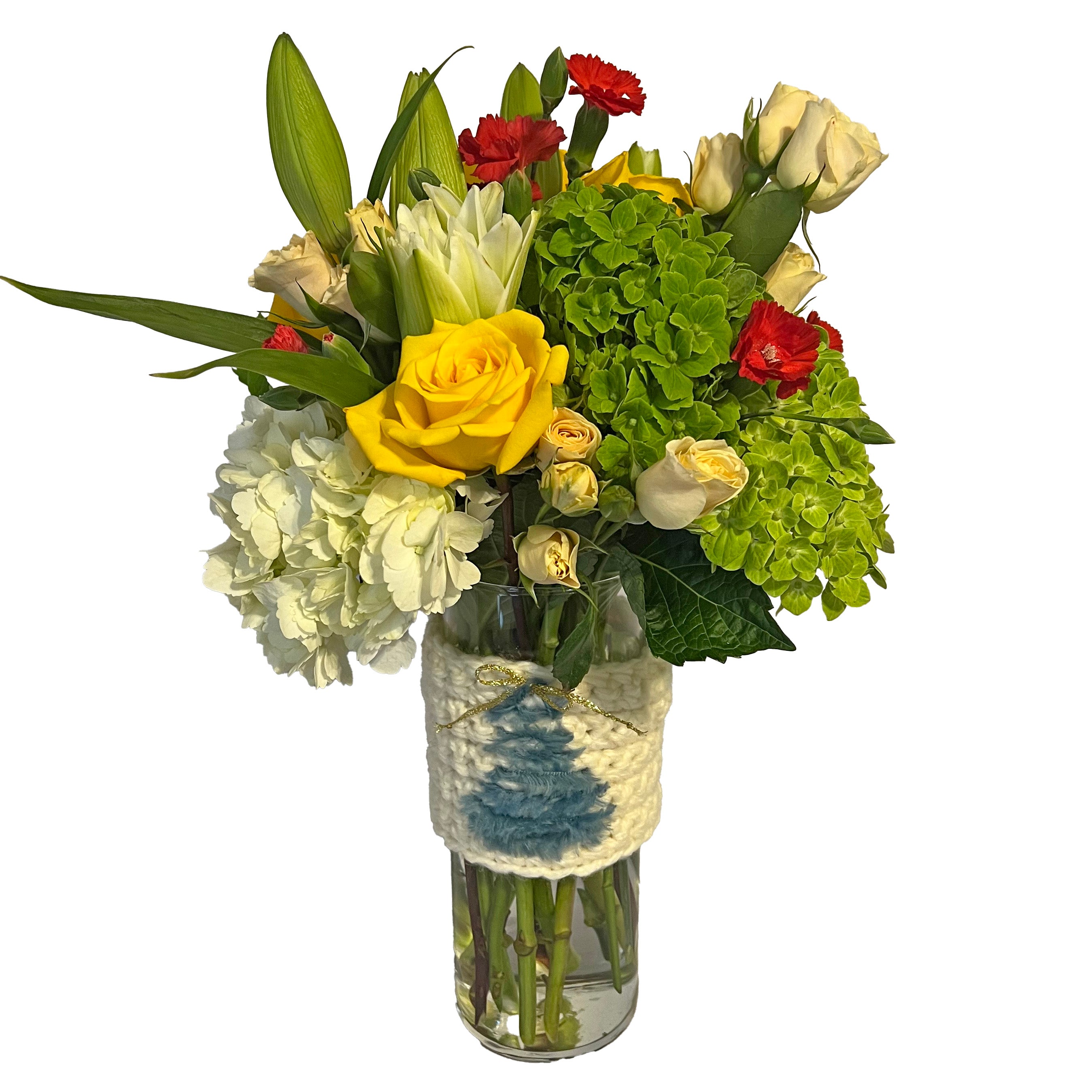 This arrangement of rose lilies, yellow roses and spray roses, hydrangea and mini carnations bring the colors of the season and a little brightness too! The vase has a crocheted mug warmer on it that can be removed and used with your favorite handleless coffee cups. (15'' tall and 8'')!