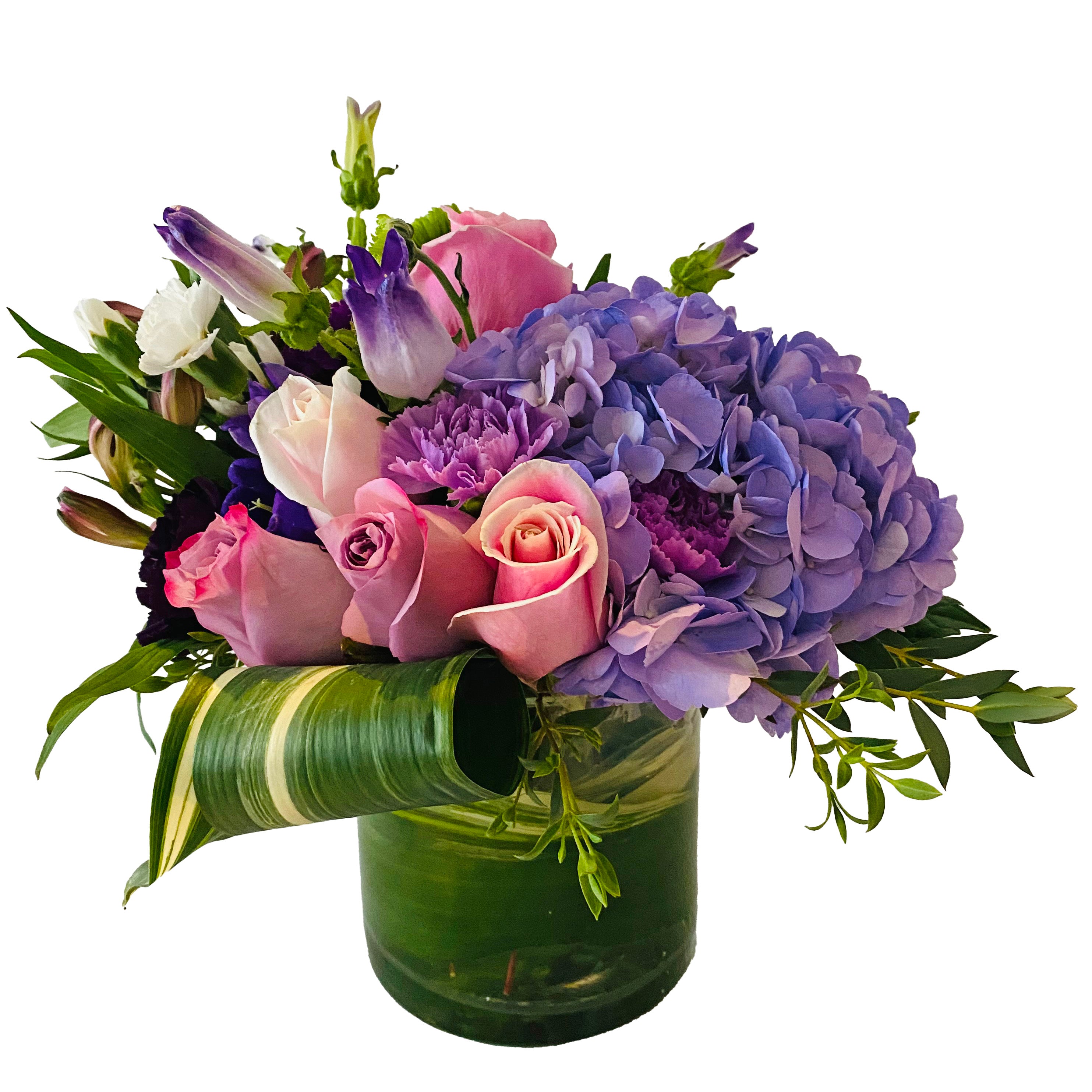 A gorgeous arrangement of garden flowers including roses, hydrangea, carnations, alstroemeria and other seasonal flowers. Hydrangea colors may change due to availability as the purple ones have a short season (8" tall and 8" across).