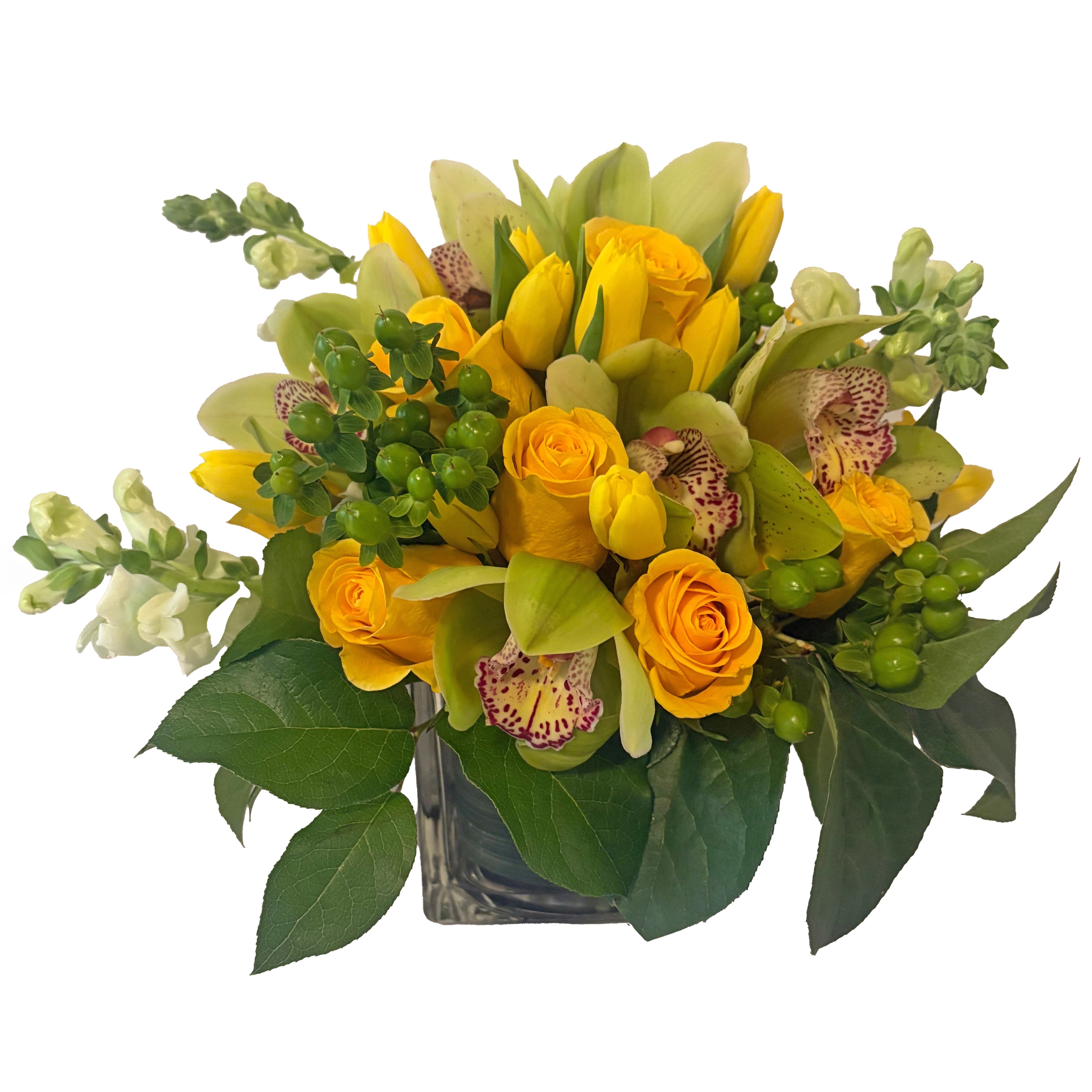 Both cheery and calm, this arrangement of yellow roses and tulips mixed with green cymbidium orchids and snapdragons is simply sublime! It's the perfect gift of flowers for that special man in your life or to send your condolences in celebration of a life well lived (10'' tall and 10''across)!