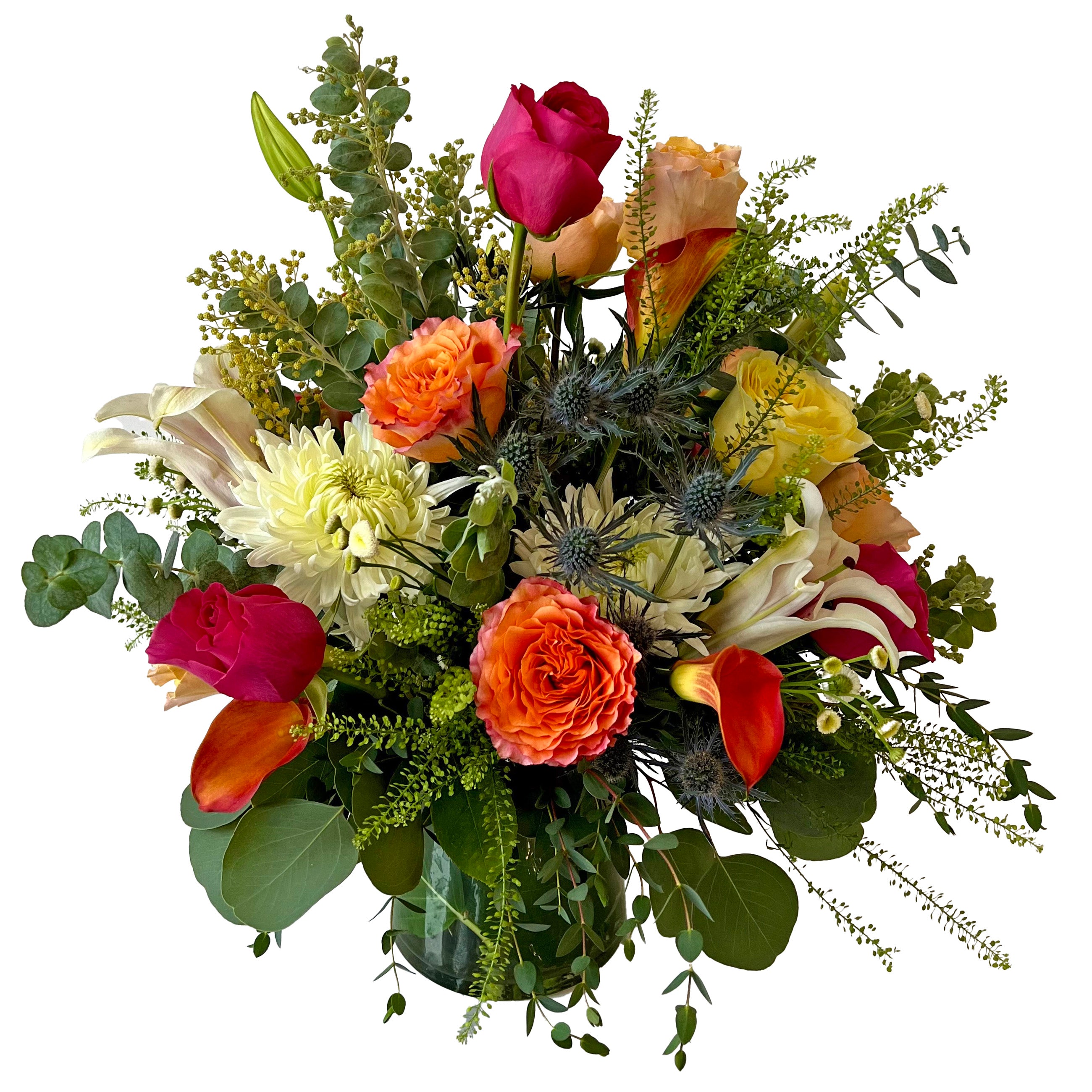 Bring the wild and fun flowers inside with this arrangement of garden roses, stargazer lilies, mums, calla lilies, thistle and wild greens. If it's time to let your hair down and celebrate, this is the arrangement for you (15" tall and 12" across).