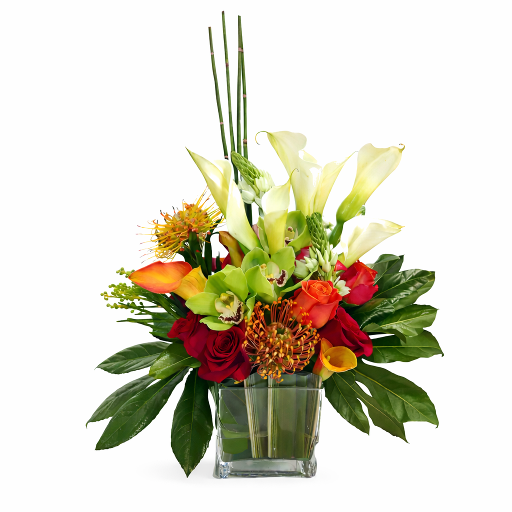 The beauty of asymmetrical design is seen in this gorgeous arrangement of Calla Lilies, Pin Cushions, Roses, Horsetail and Greens. It's a warm-colored, taller piece; perfect for your home or office (20'' tall and 12'' across).