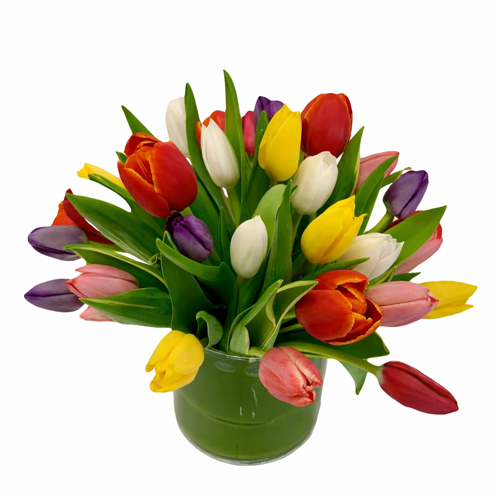 Bright colors spice up this arrangement of tulips oozing spring with every stem. It's a truly beautiful piece sure to please any recipient and make their neighbors jealous (9'' tall and 8'' across)! Colors may vary based on availability.