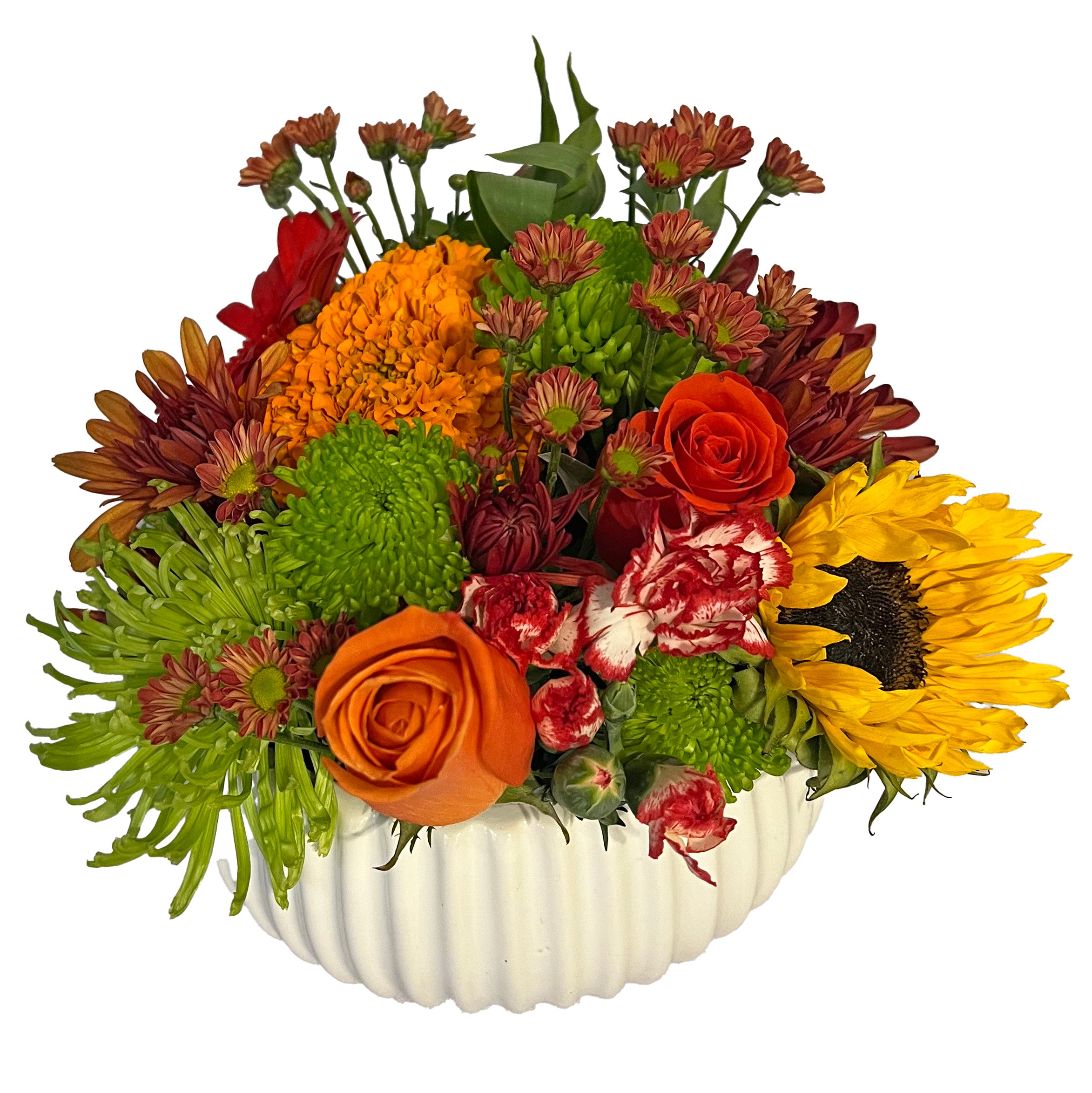 This pave arrangement captures all the colors and textures of fall in one amazing piece. It's the perfect centerpiece for your fall party or Thanksgiving holiday. You can also share it with friends or neighbors as you give thanks (6" tall and 8" across).