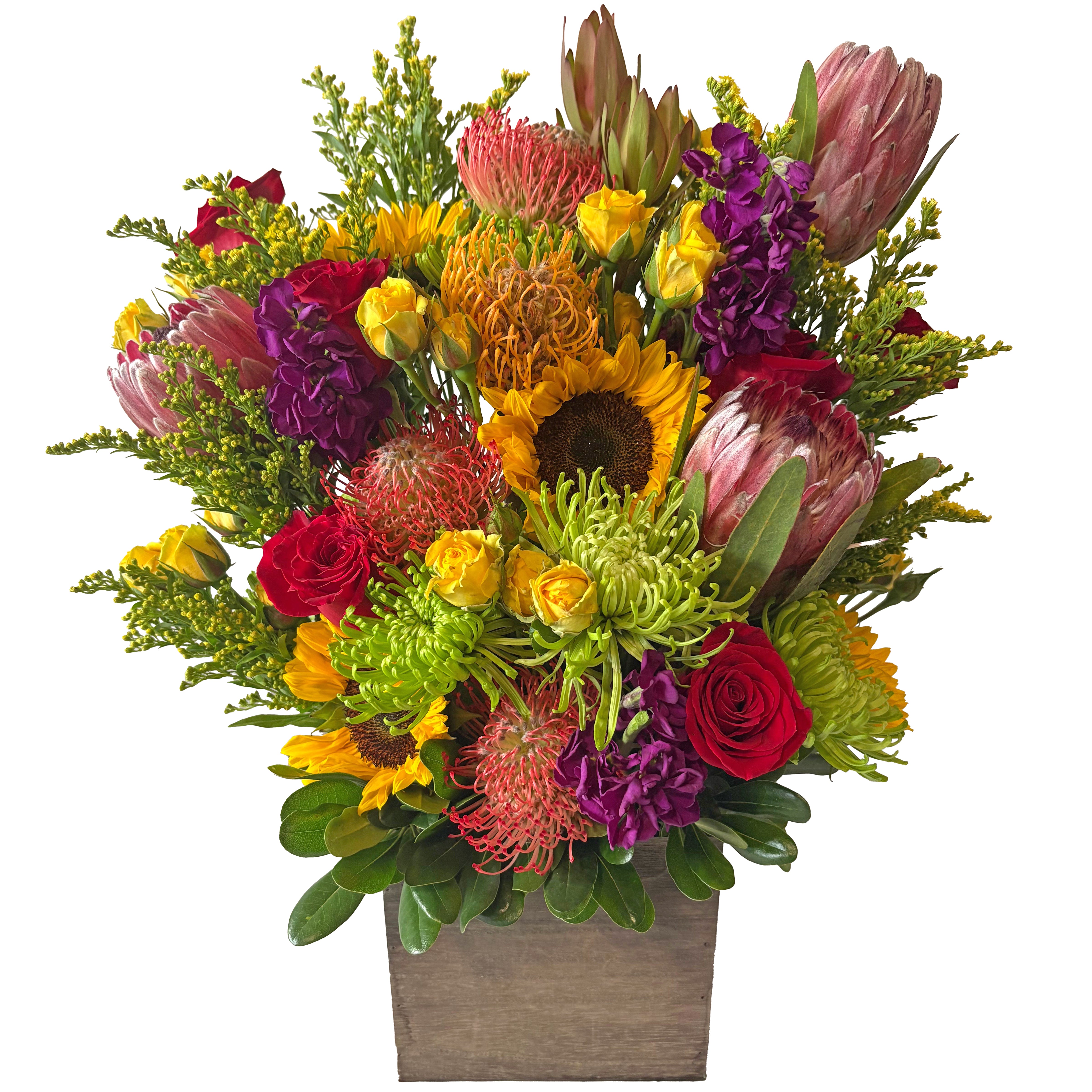 What's better than an edible arrangement? Our box of colorful, tropical flowers is! And it has zero calories!! This is the best kind of gift to give and will surely last longer than food. It has all the colors and textures to keep one captivated and feeling like a million bucks (18'' tall and 12'' across)!